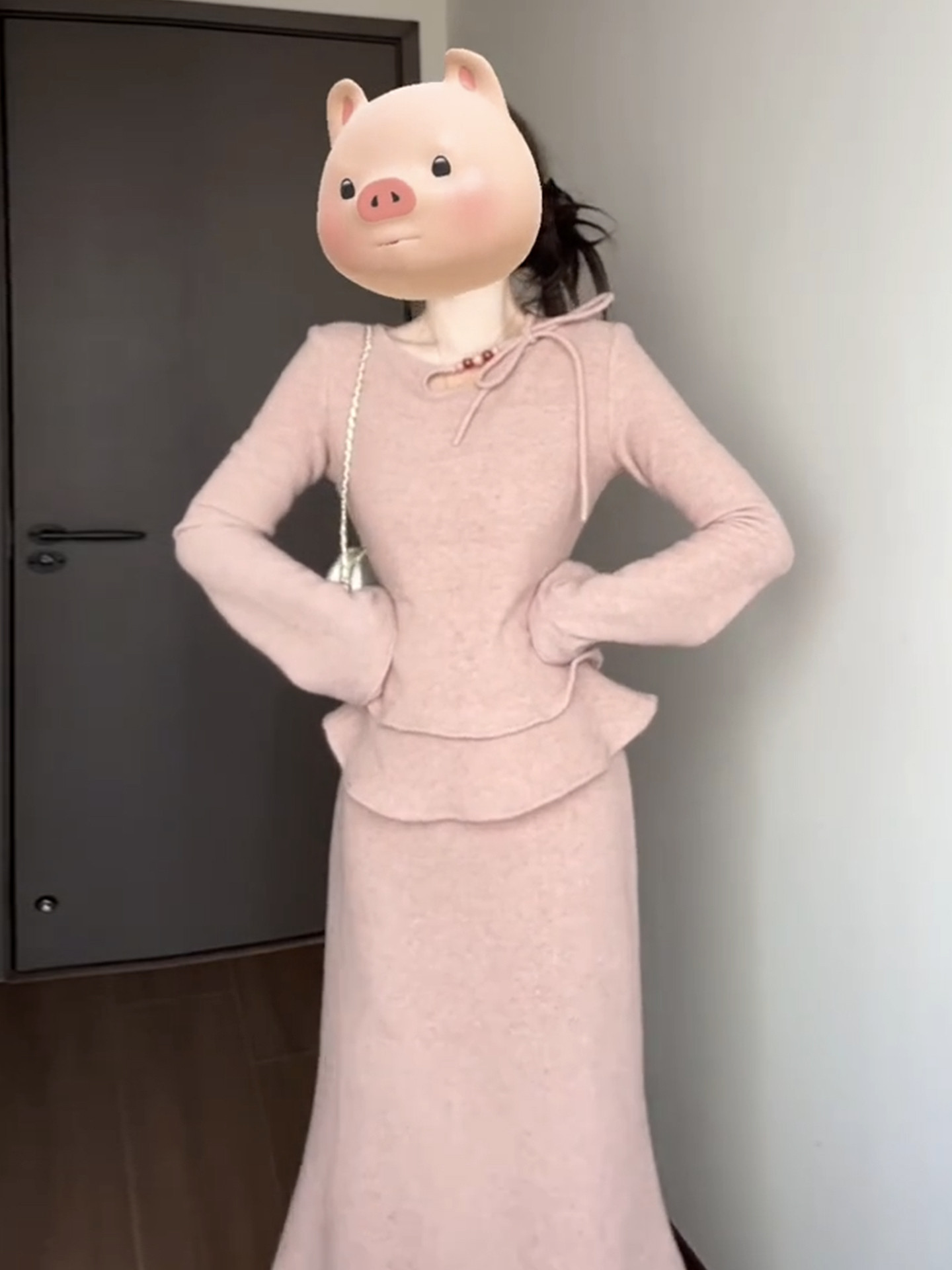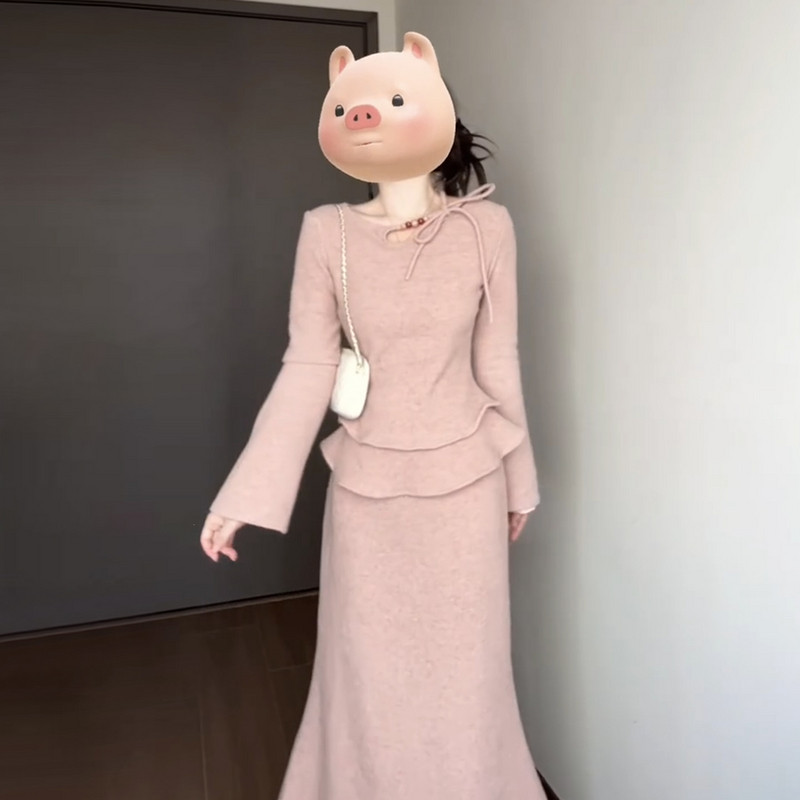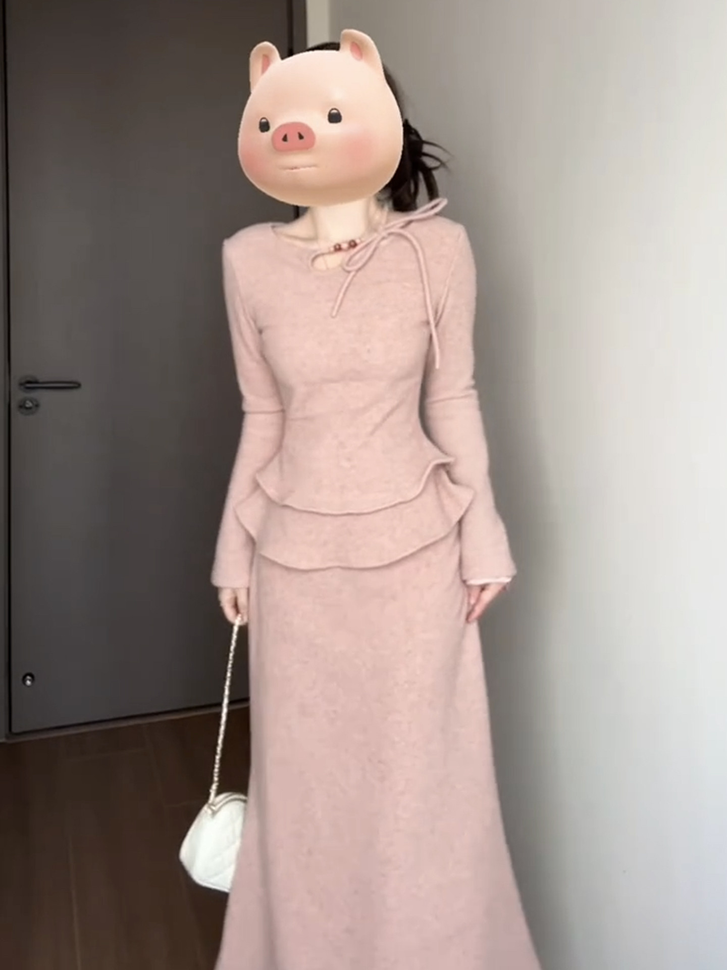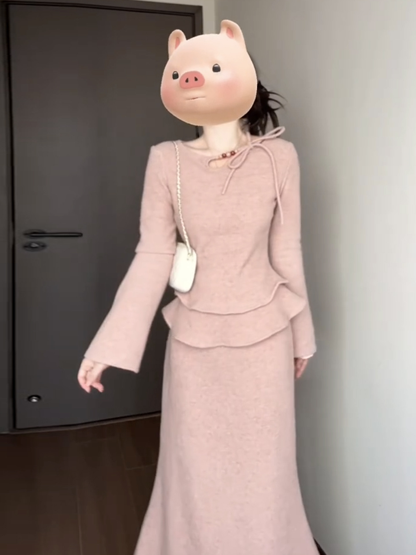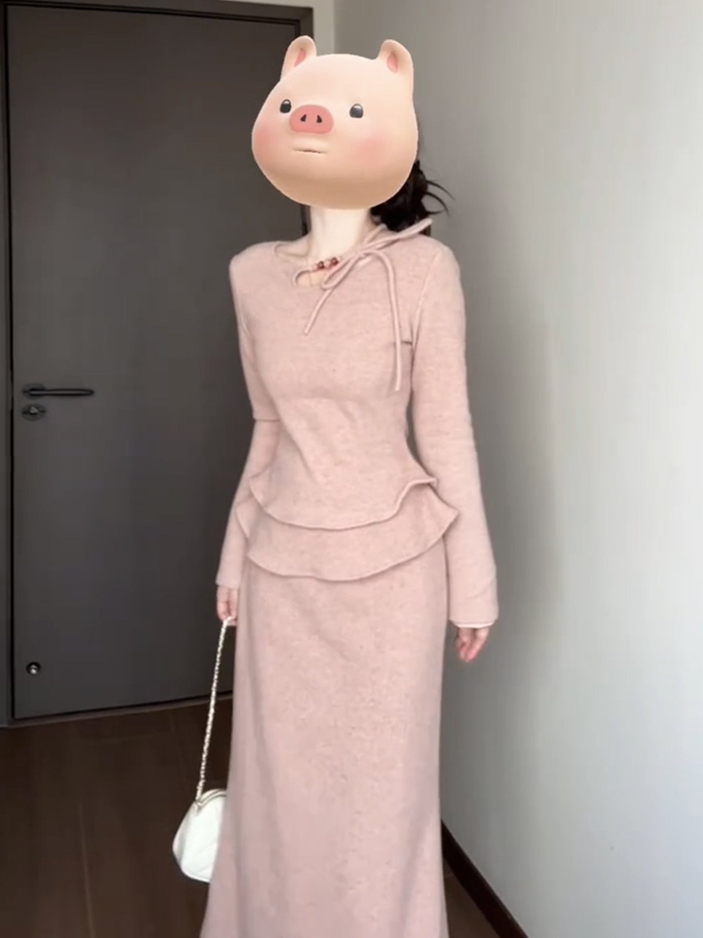 温柔气质新中式粉色荷叶边连衣裙女秋冬巨好看高级感针织长裙套装