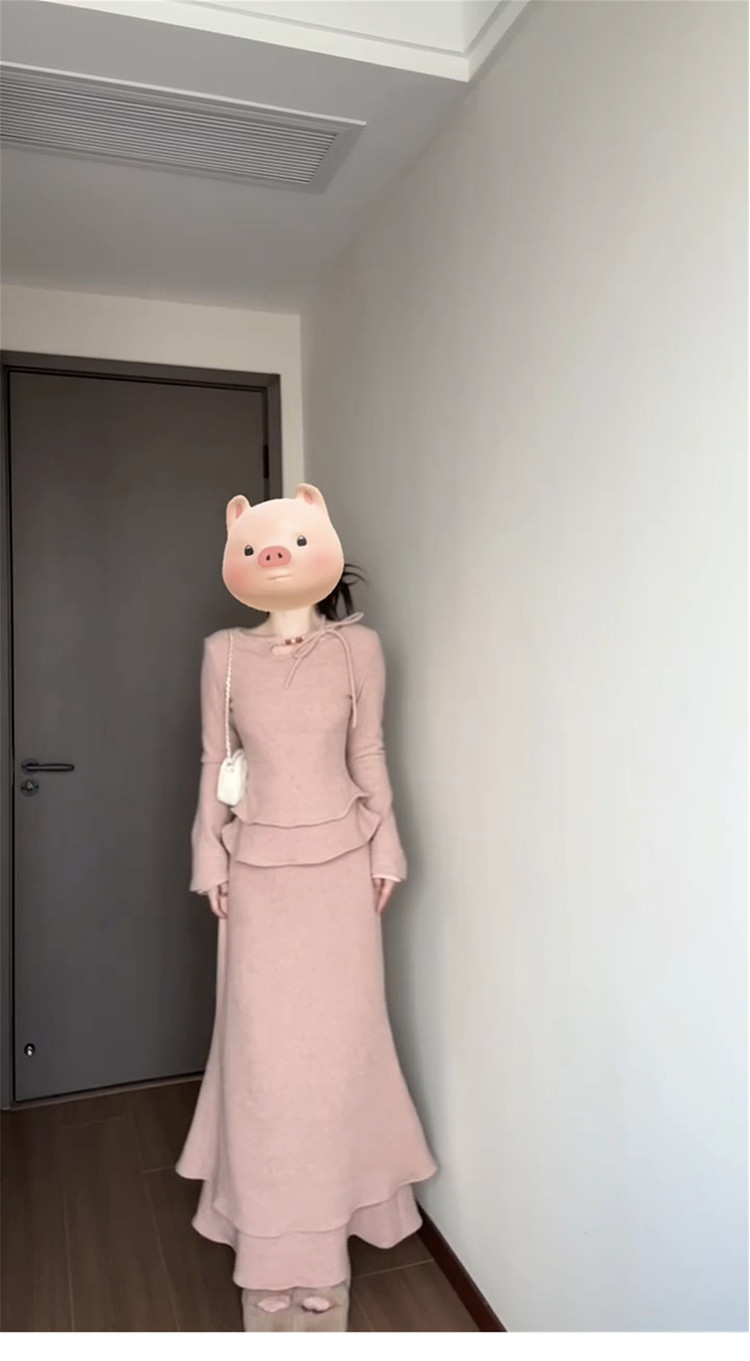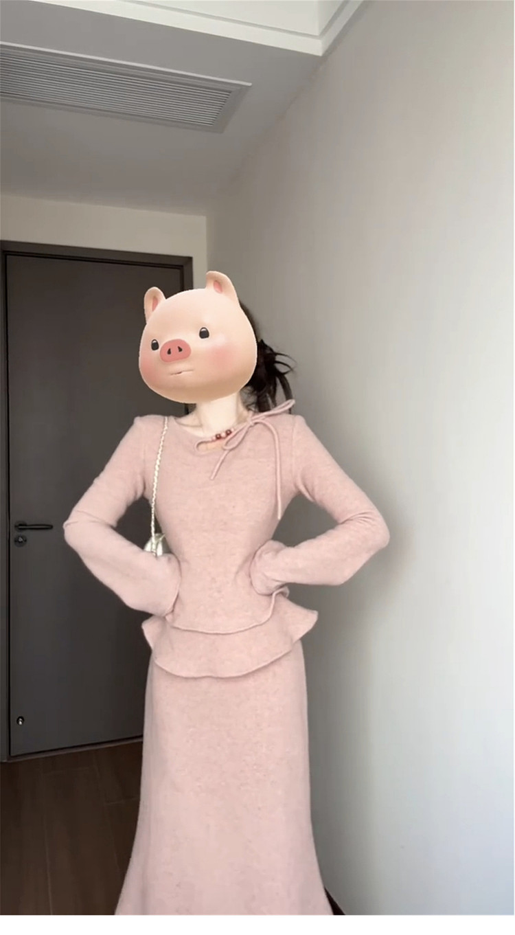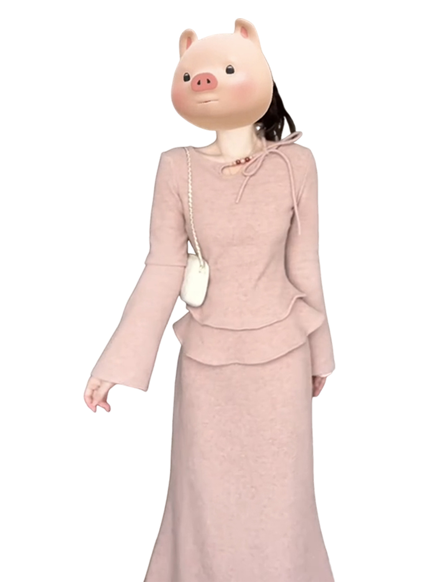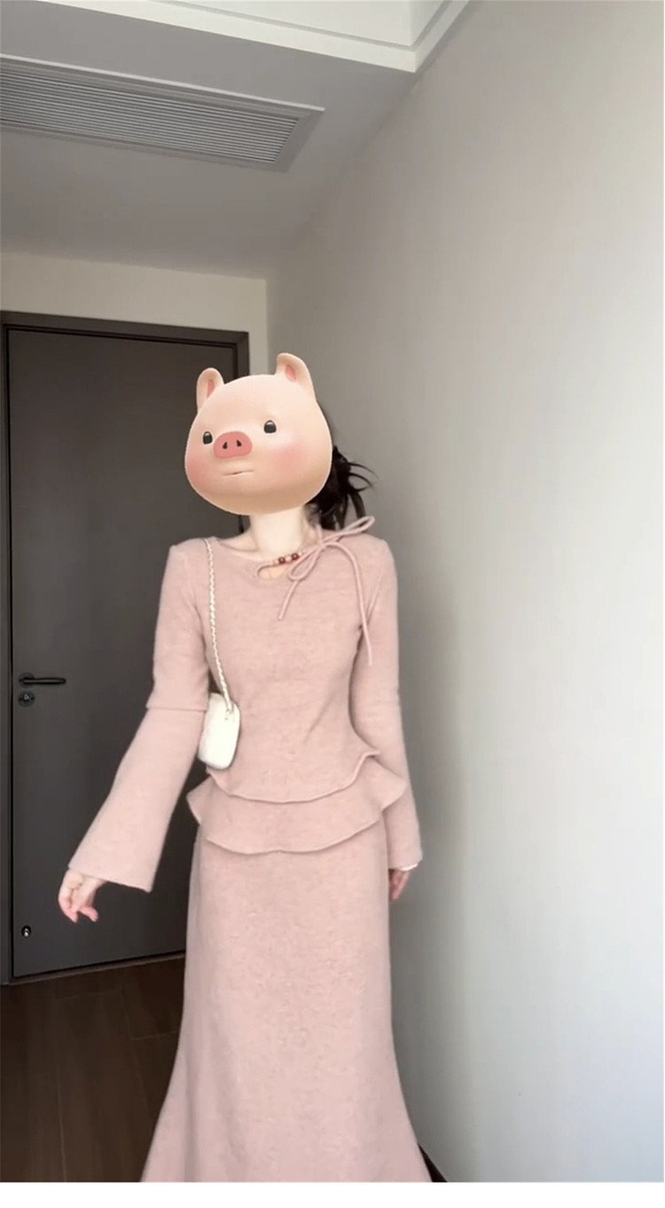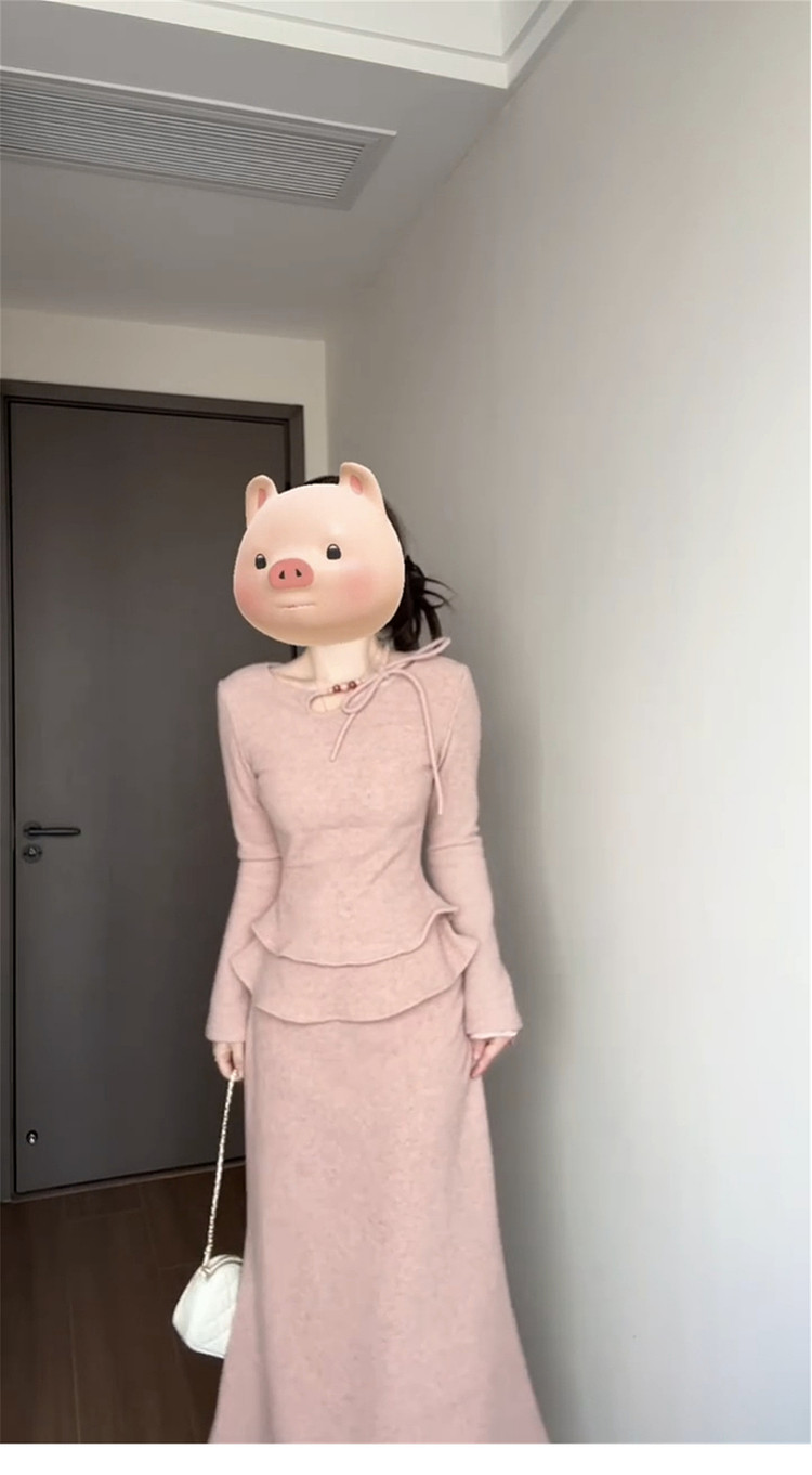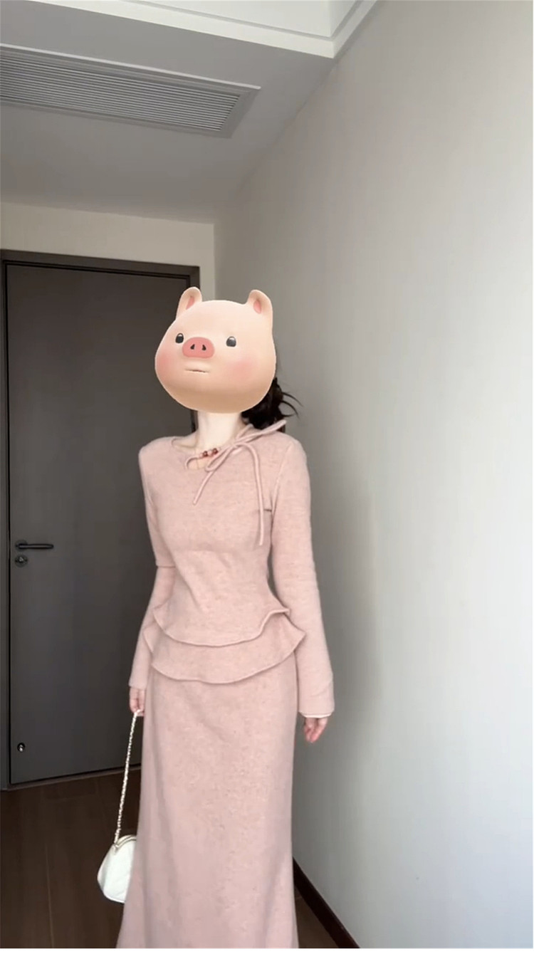 温柔气质新中式粉色荷叶边连衣裙女秋冬巨好看高级感针织长裙套装
