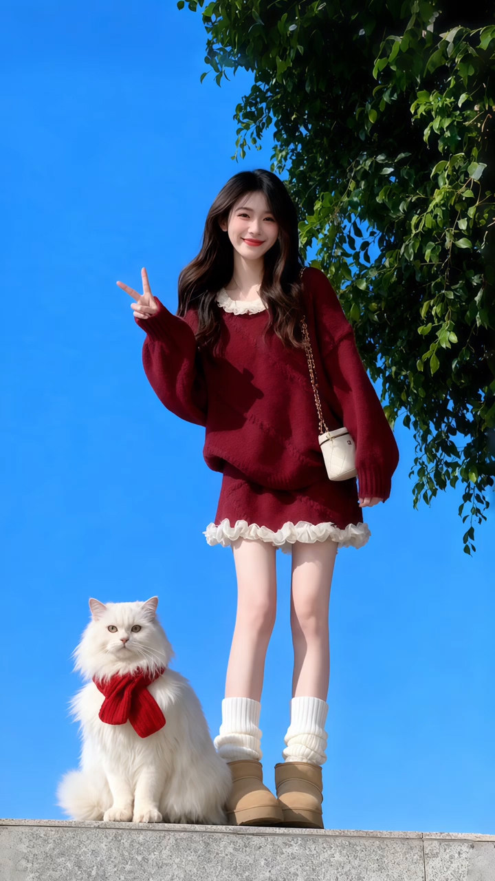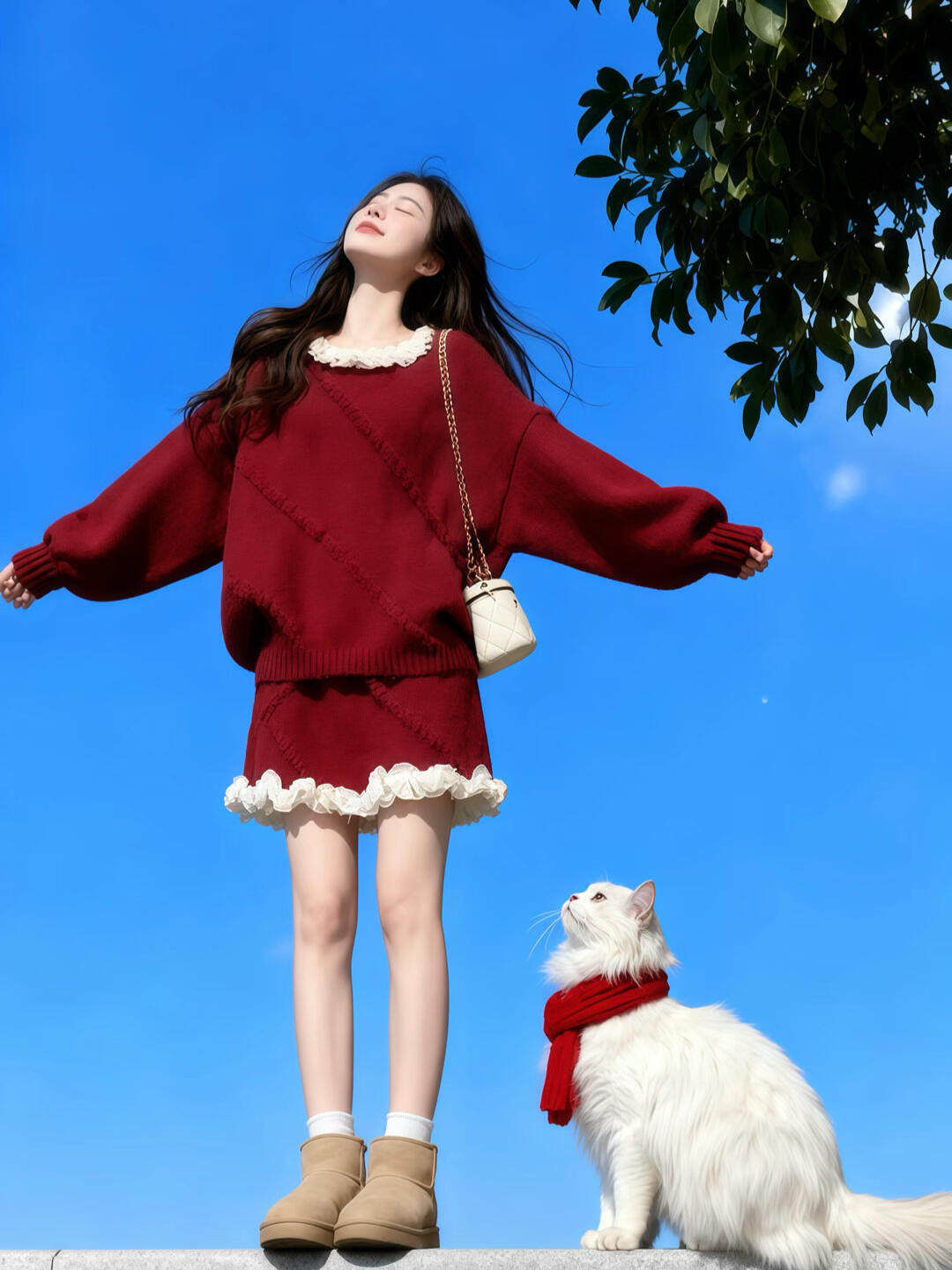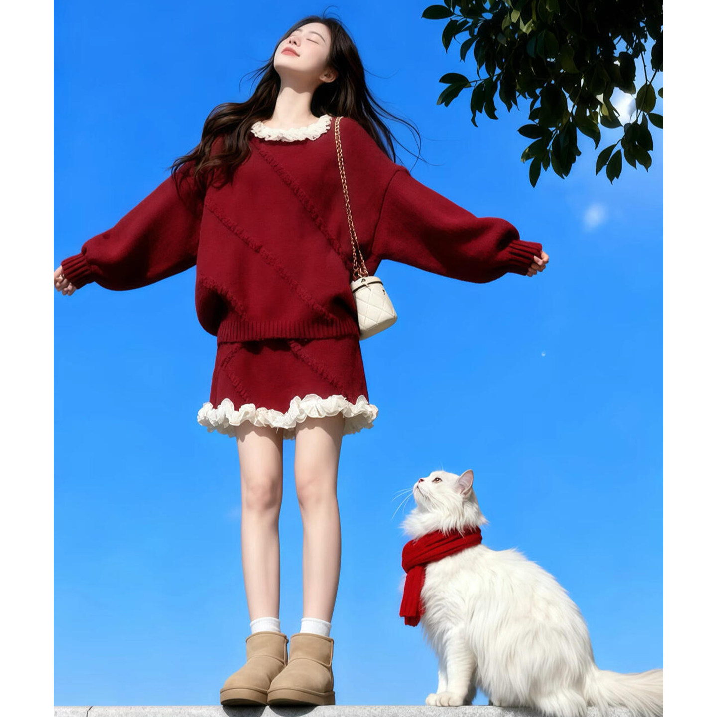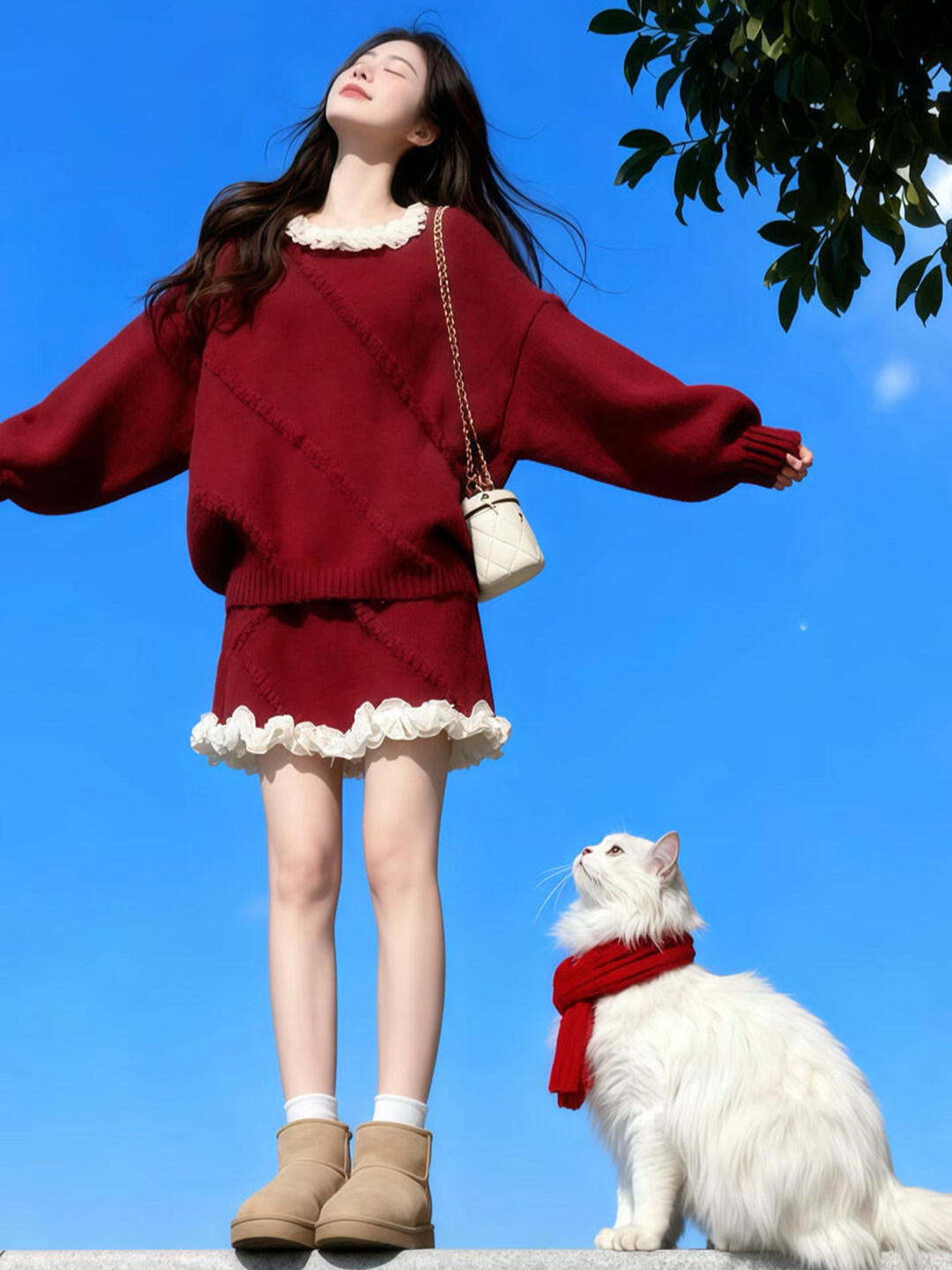 独特漂亮绝美小套装温柔风复古红色针织上衣a字短裙两件套2025冬