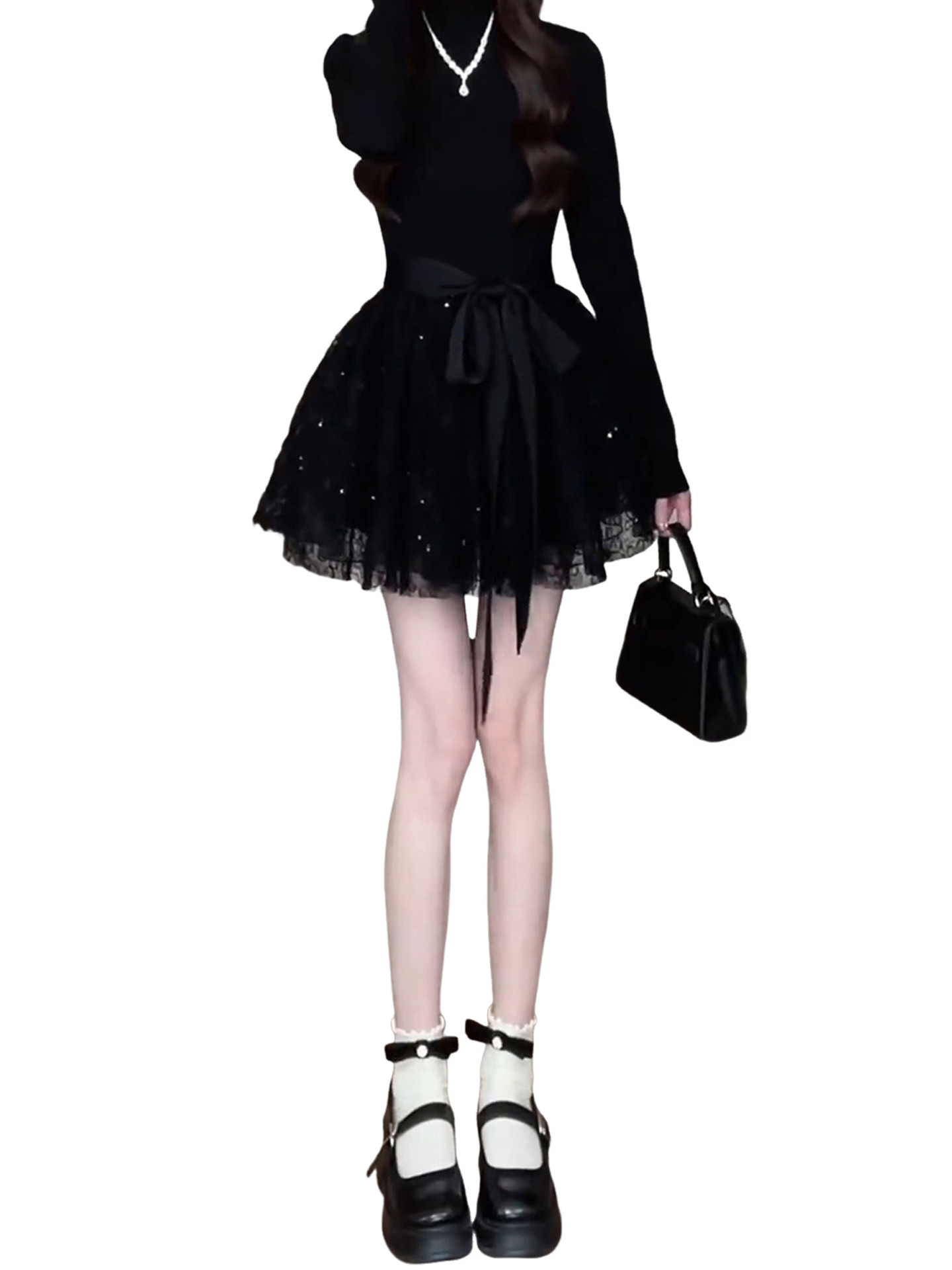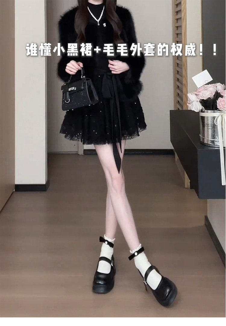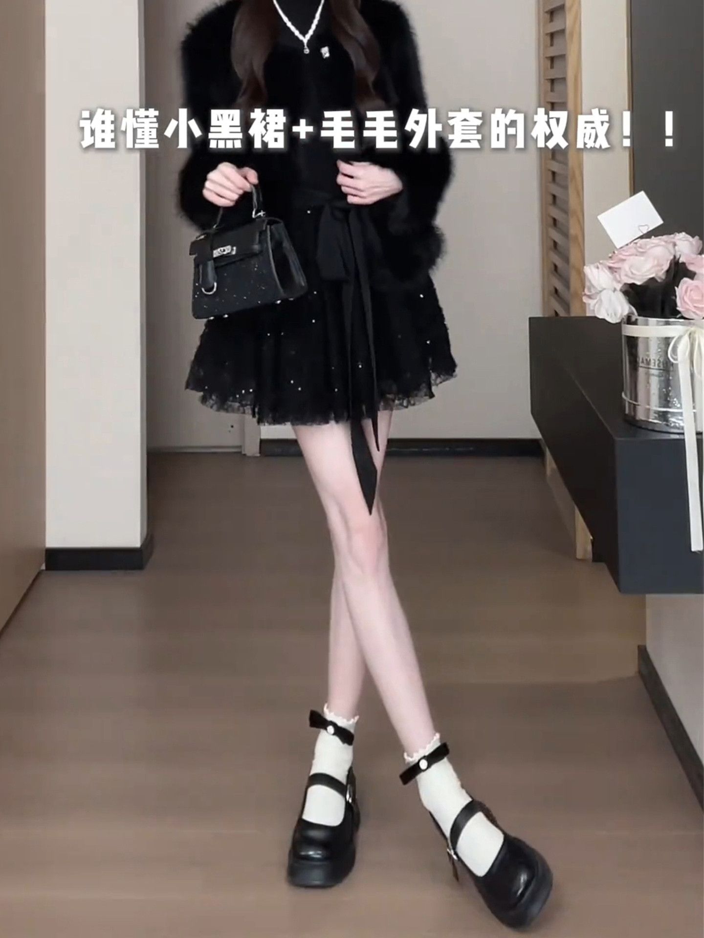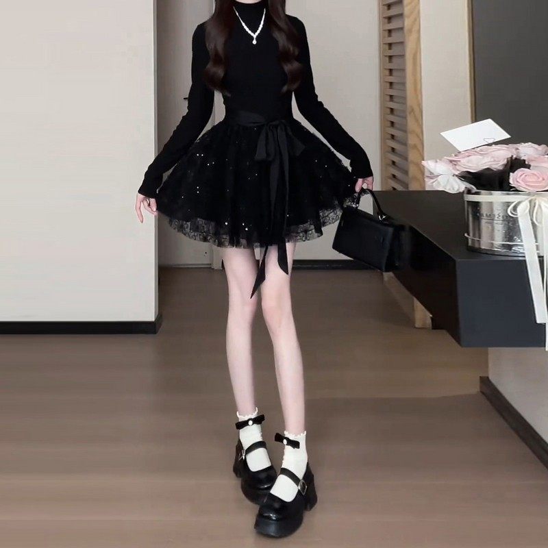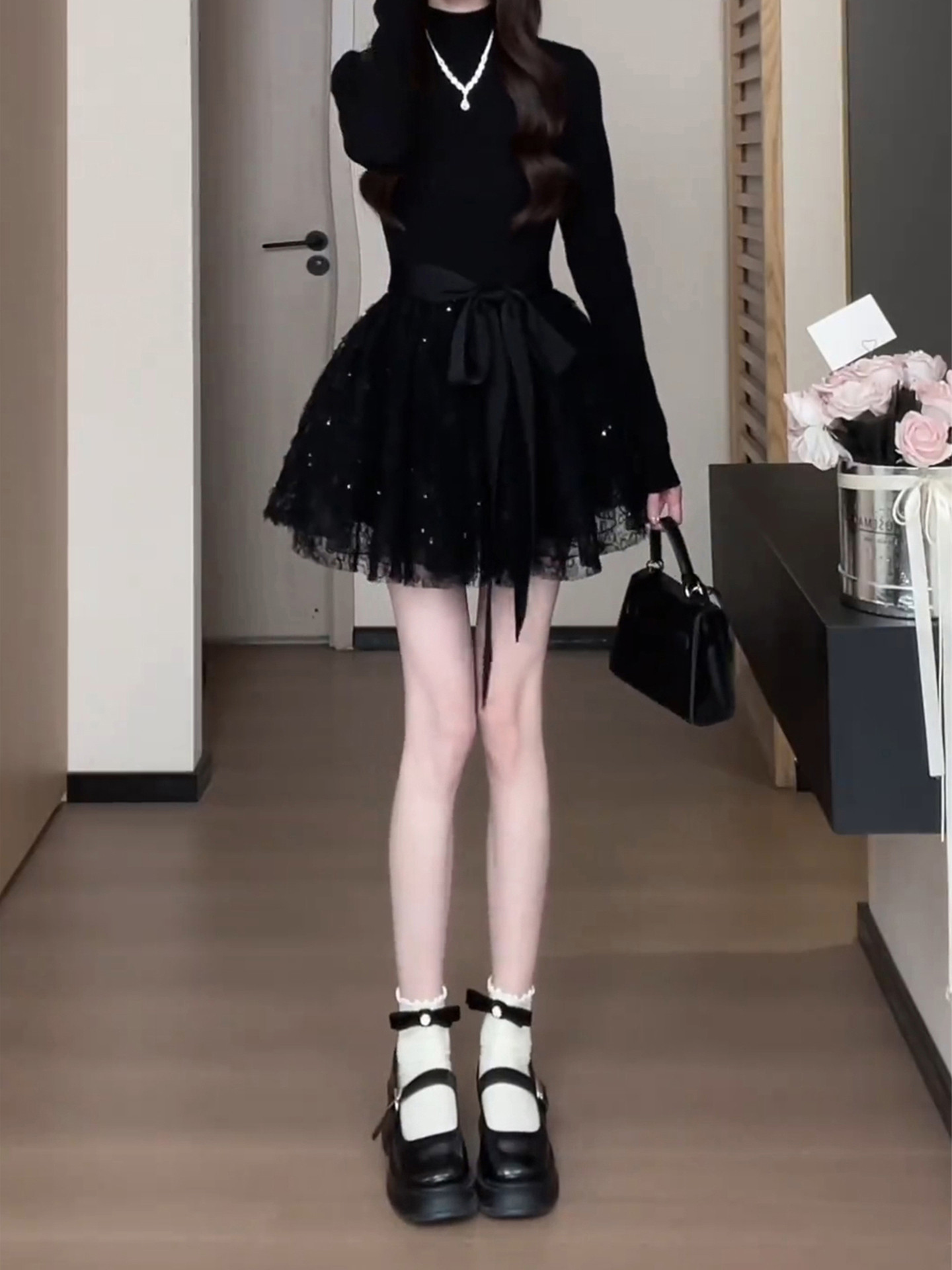 小香赫本风黑色连衣裙子女秋冬2025新款气质收腰千金风蓬蓬小黑裙