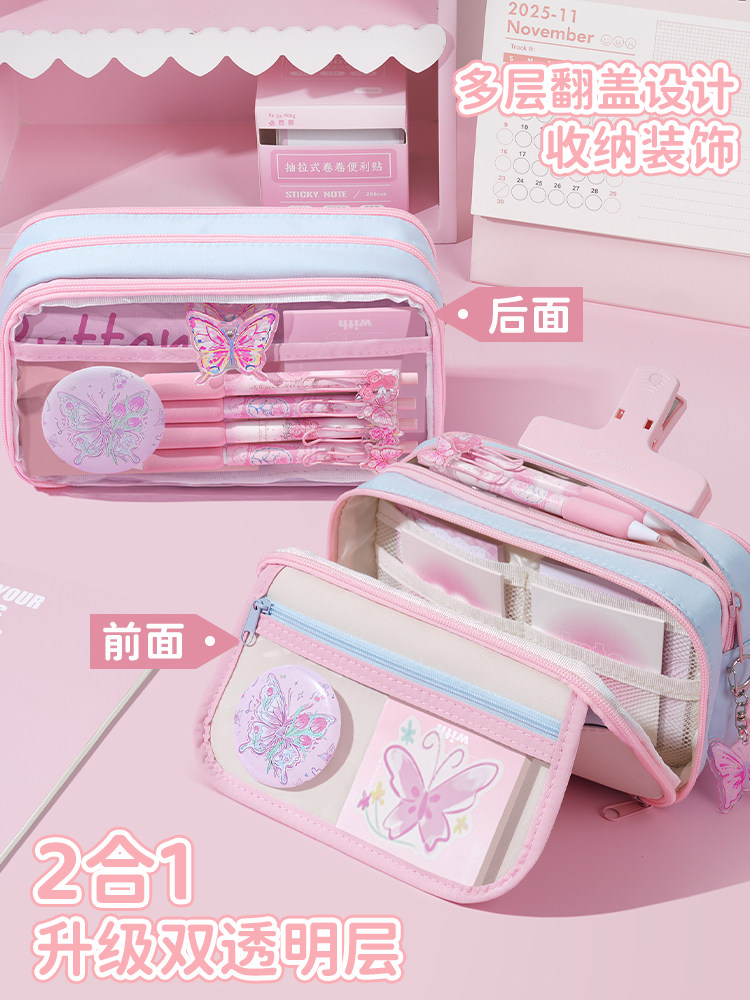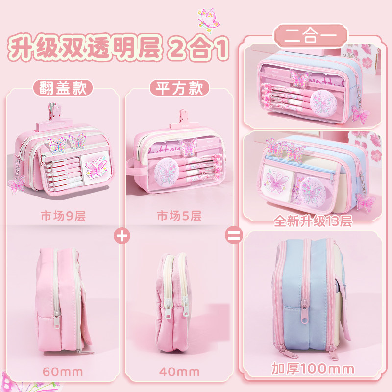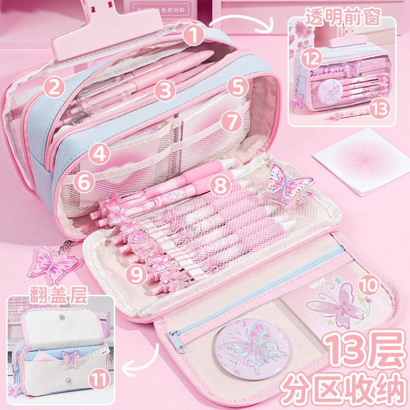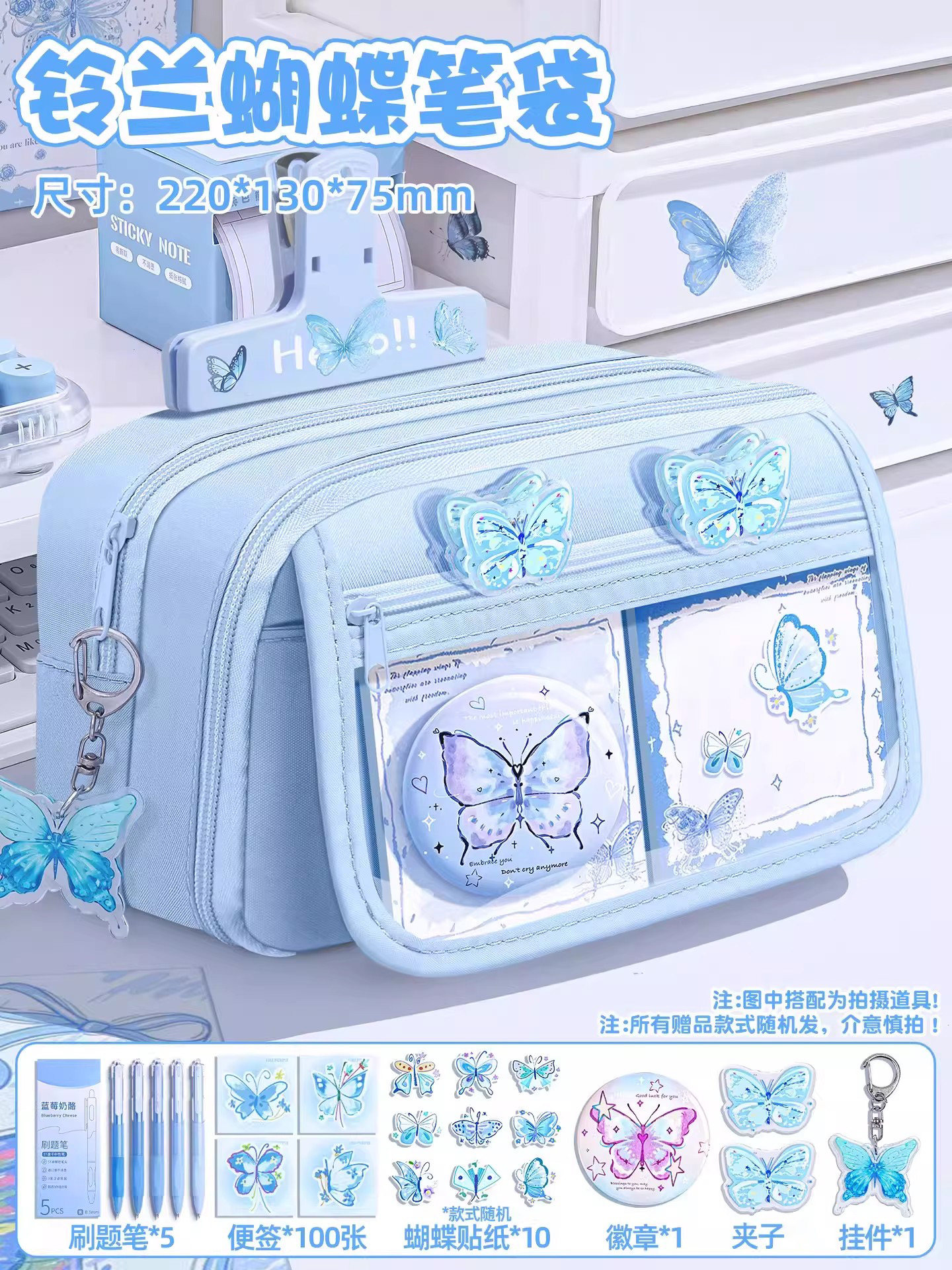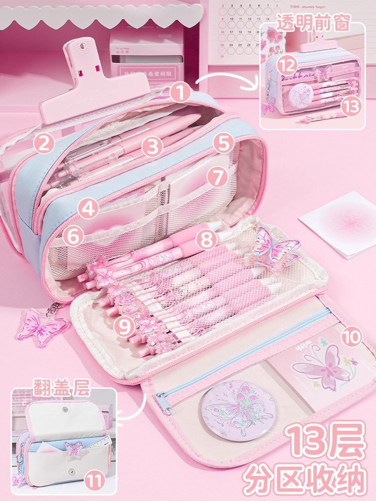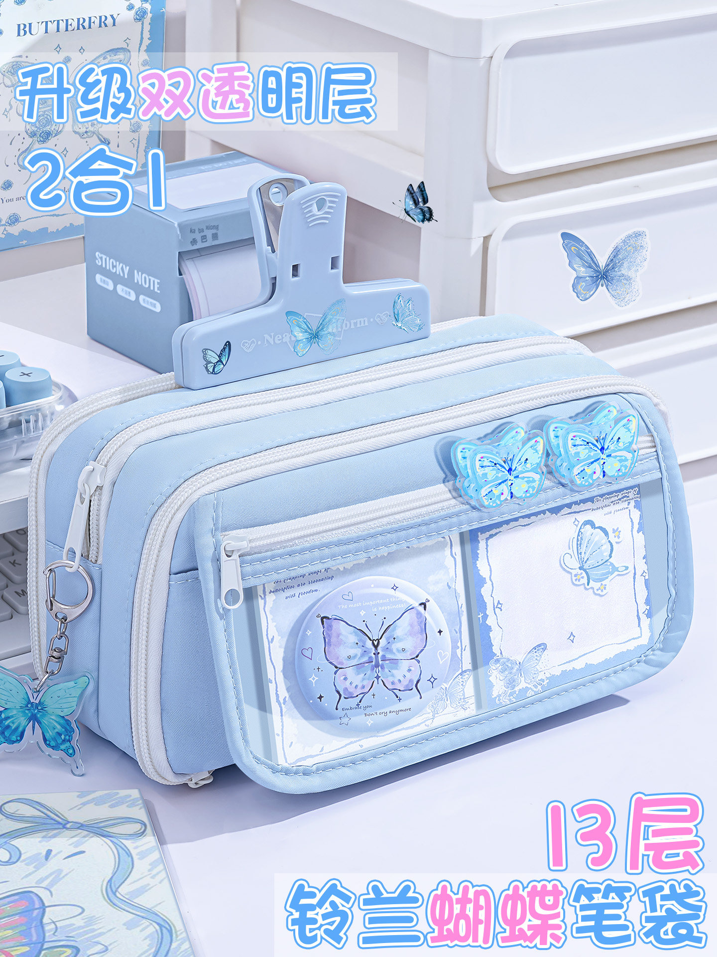 铃兰蝴蝶一套配齐~13层大容量笔袋女生2026新款超火高颜值ins风文具盒女孩款小学生透明铅笔盒2025初中不撞款