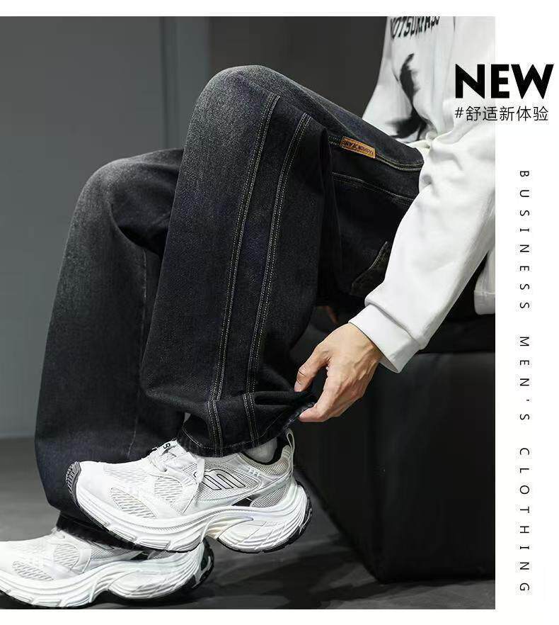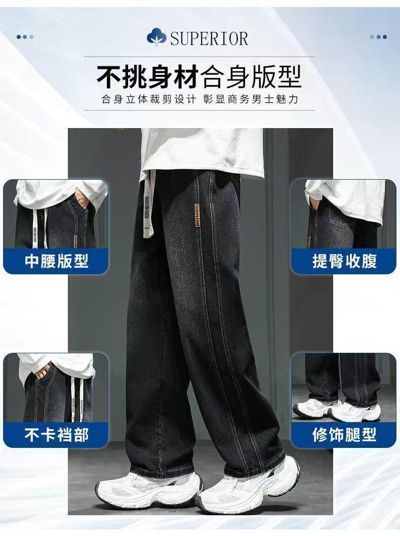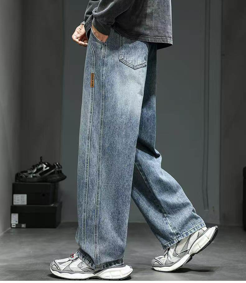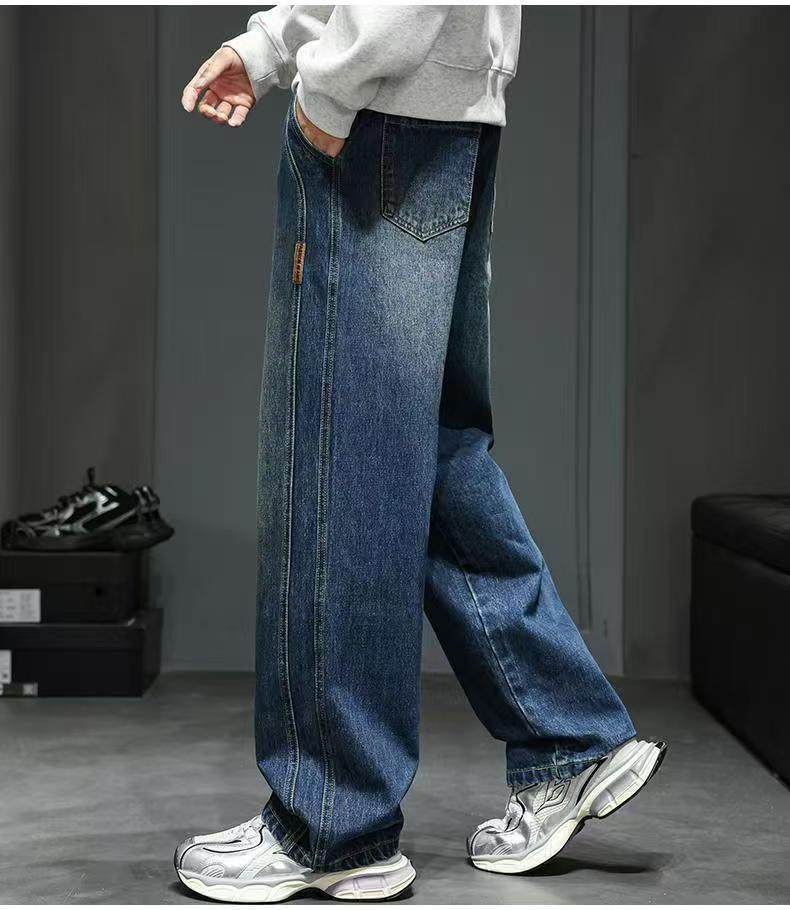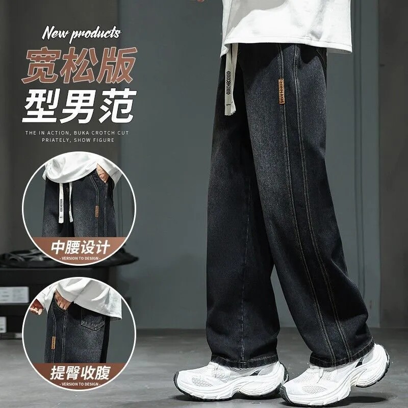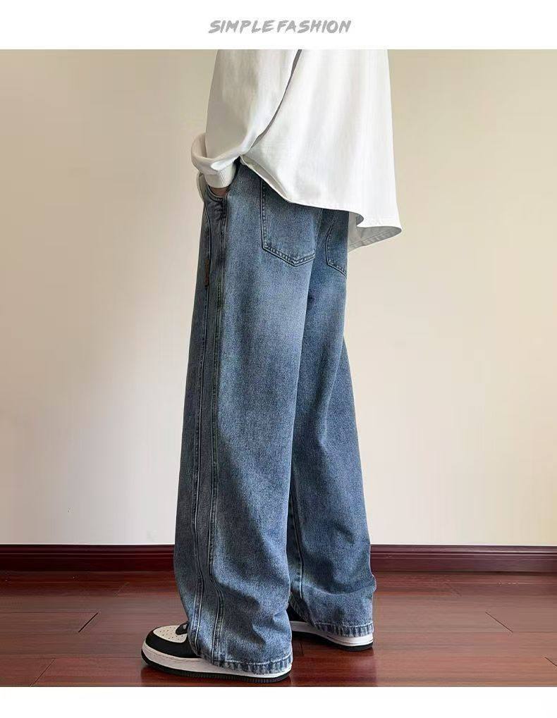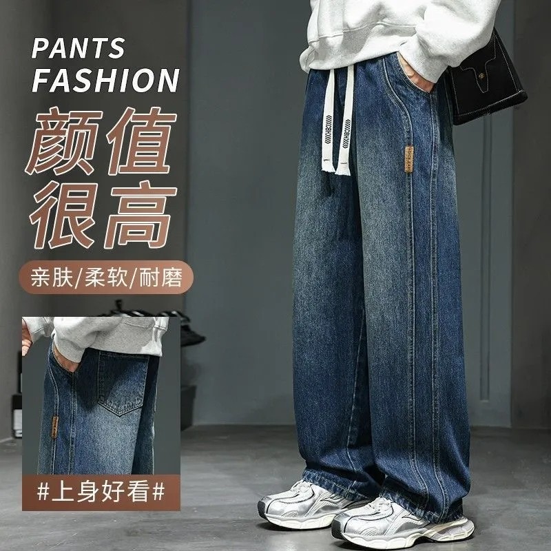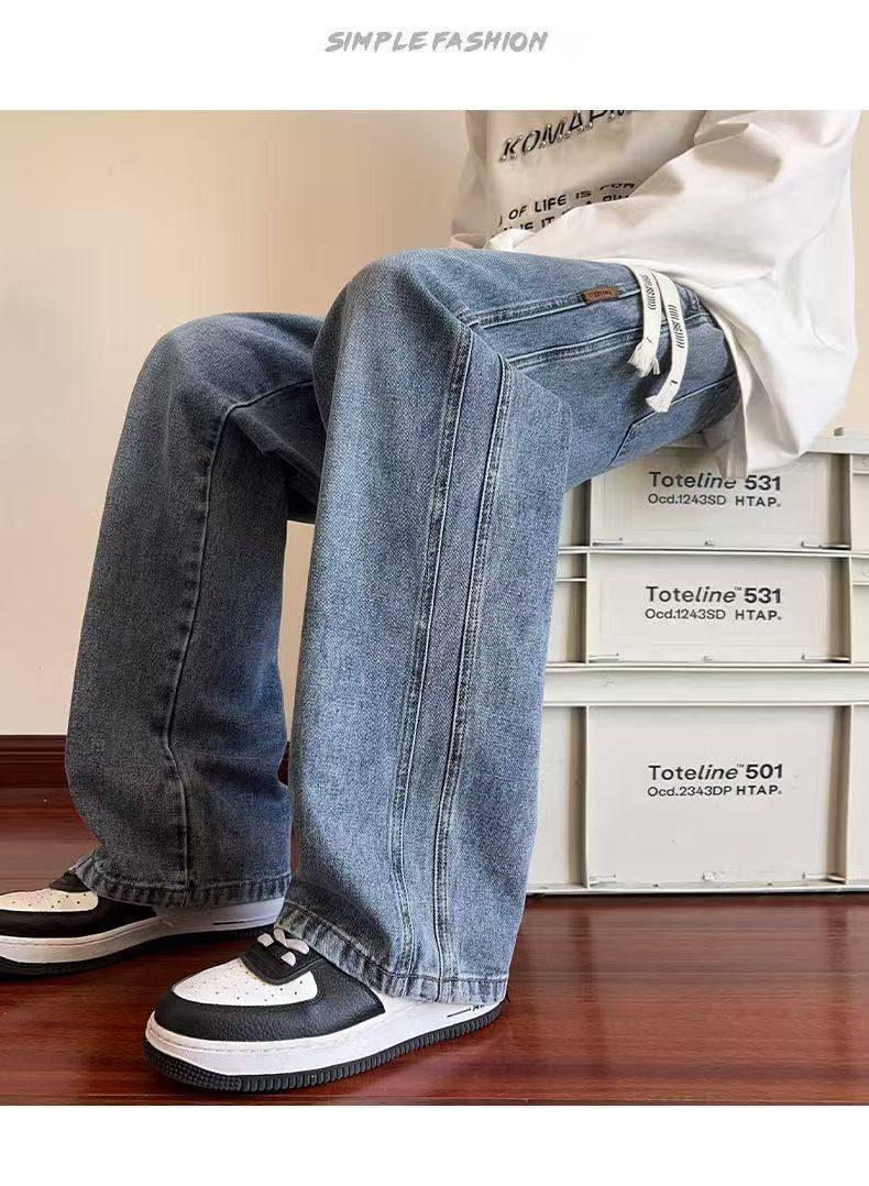 春秋牛仔裤男款水洗复古宽松直筒美式潮流夏季抽绳阔腿休闲长裤子