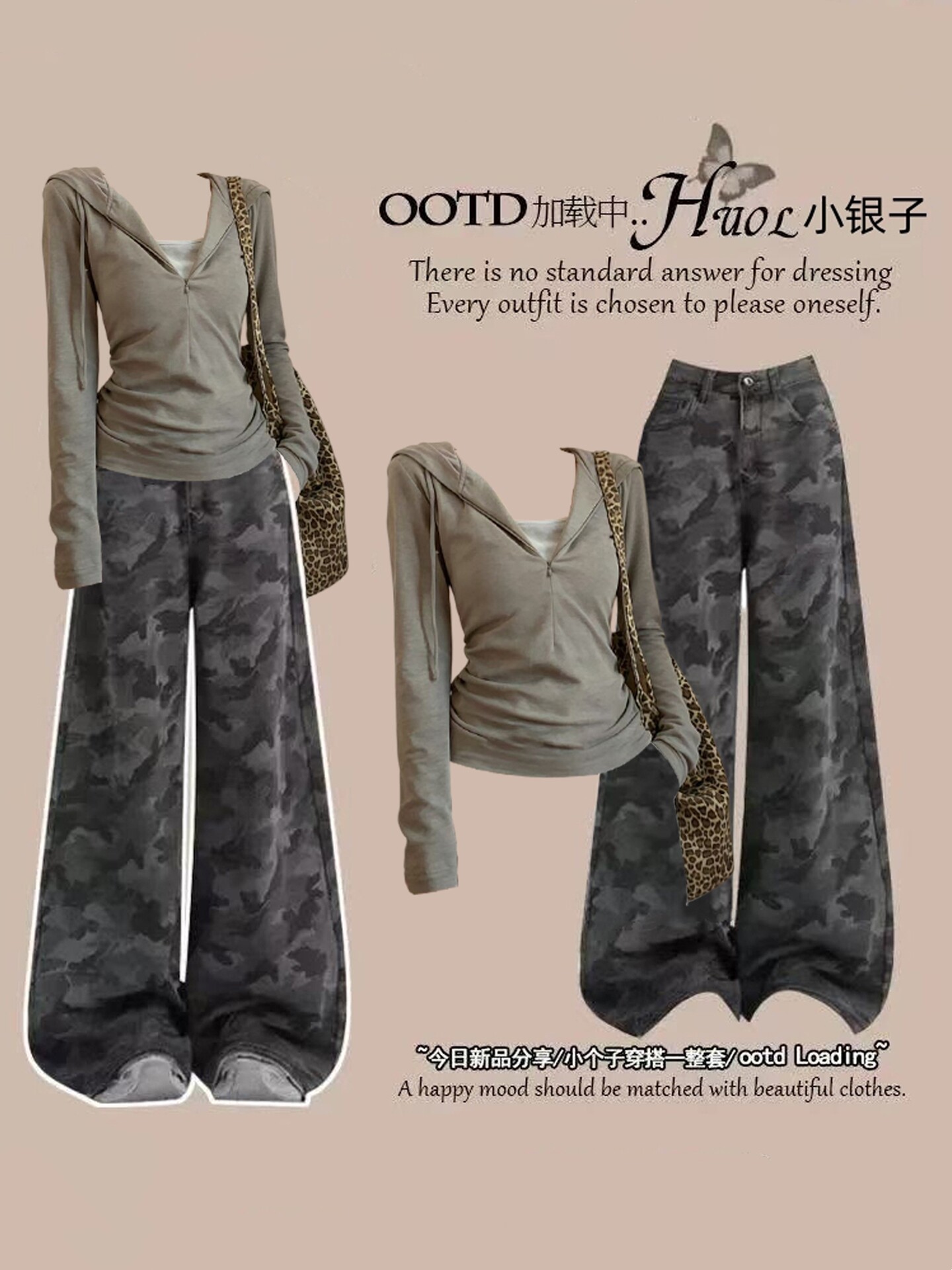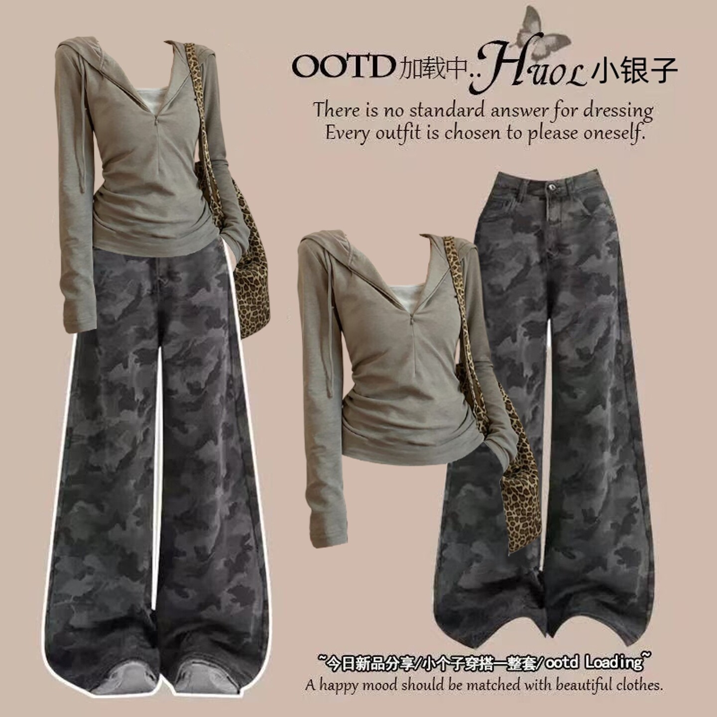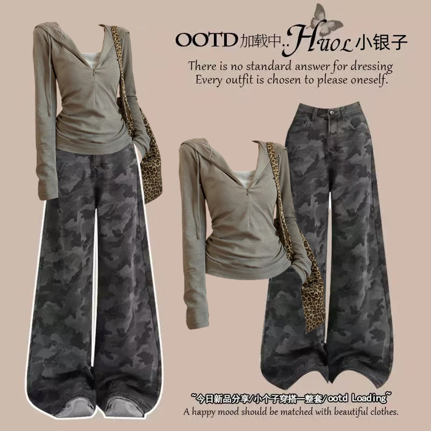 巨好看的韩系假两件连帽长袖上衣女春高腰迷彩又a又飒牛仔套装裤