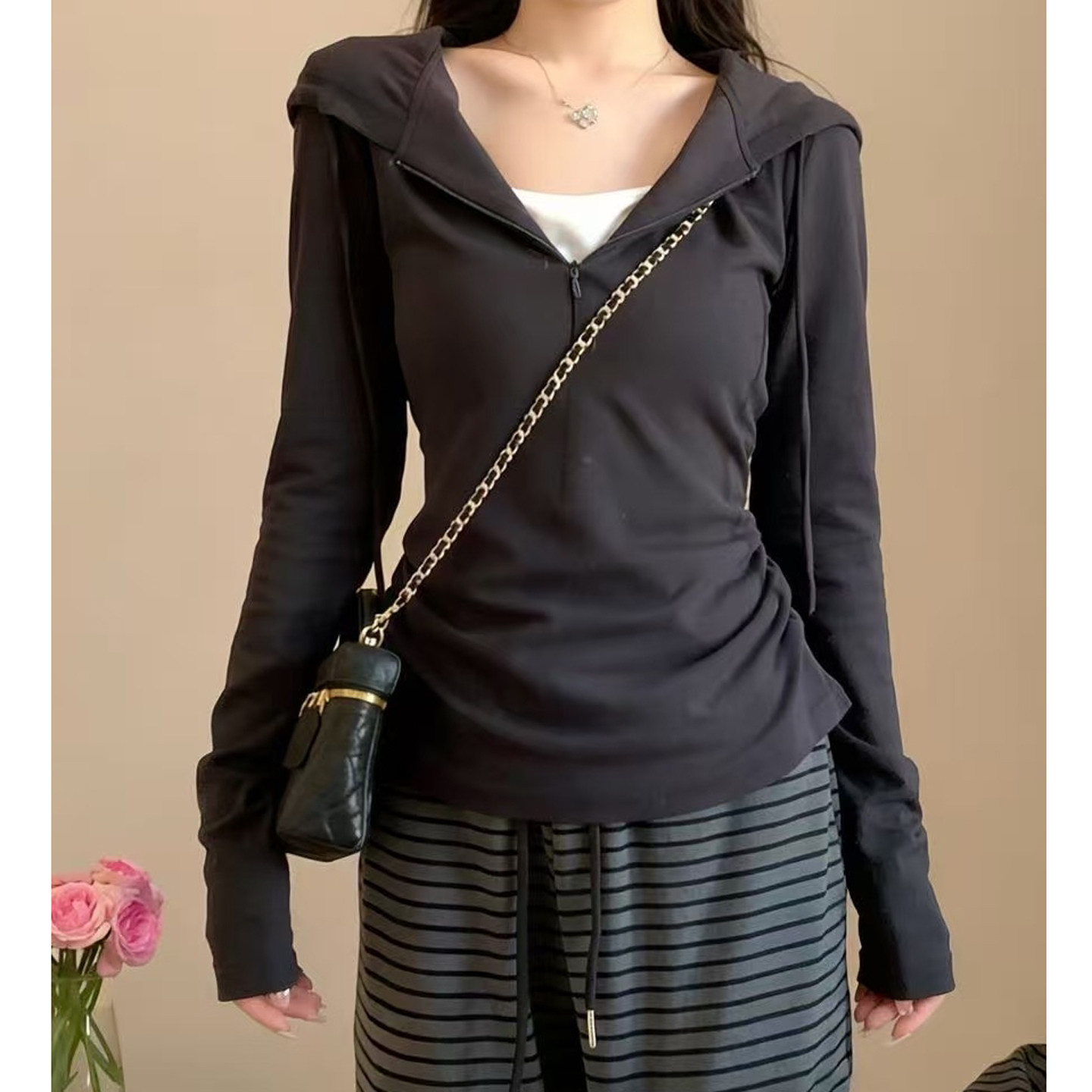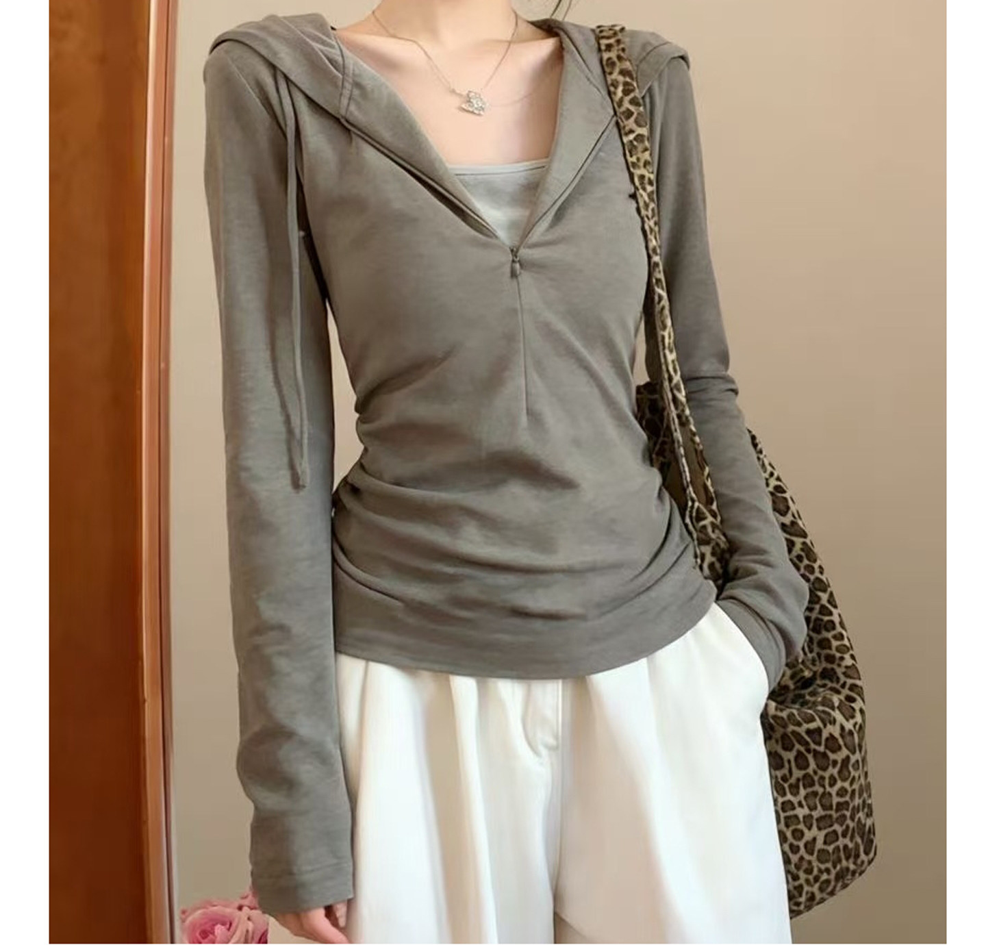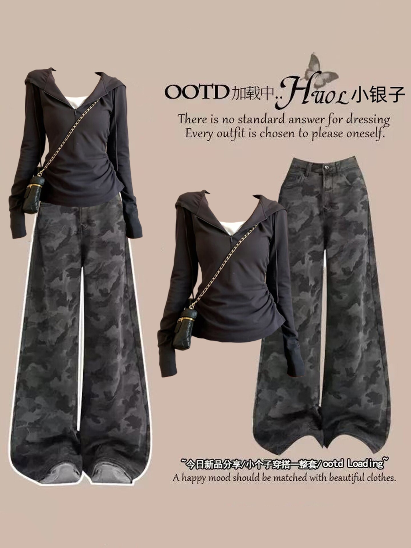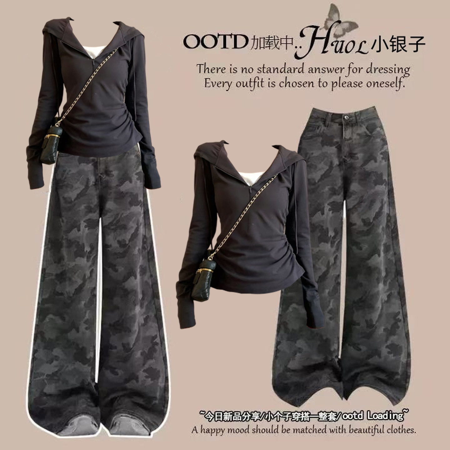 巨好看的韩系假两件连帽长袖上衣女春高腰迷彩又a又飒牛仔套装裤