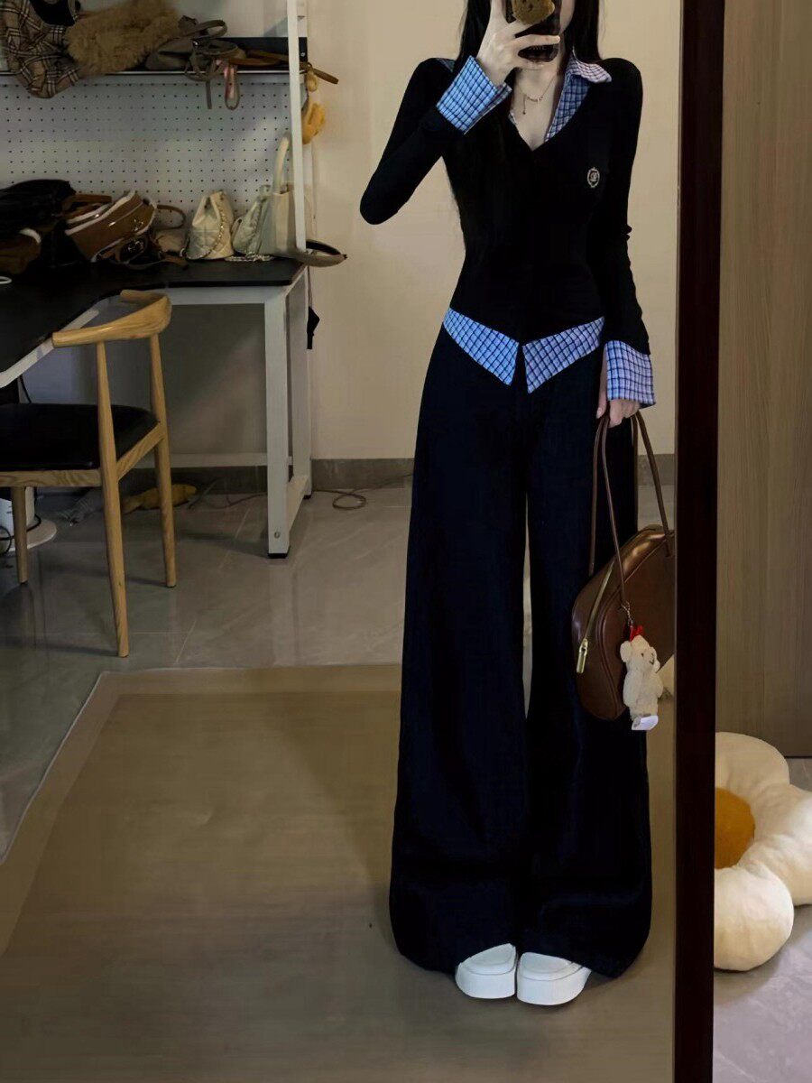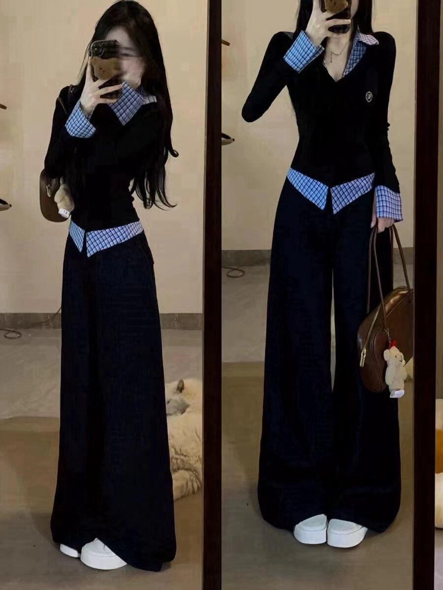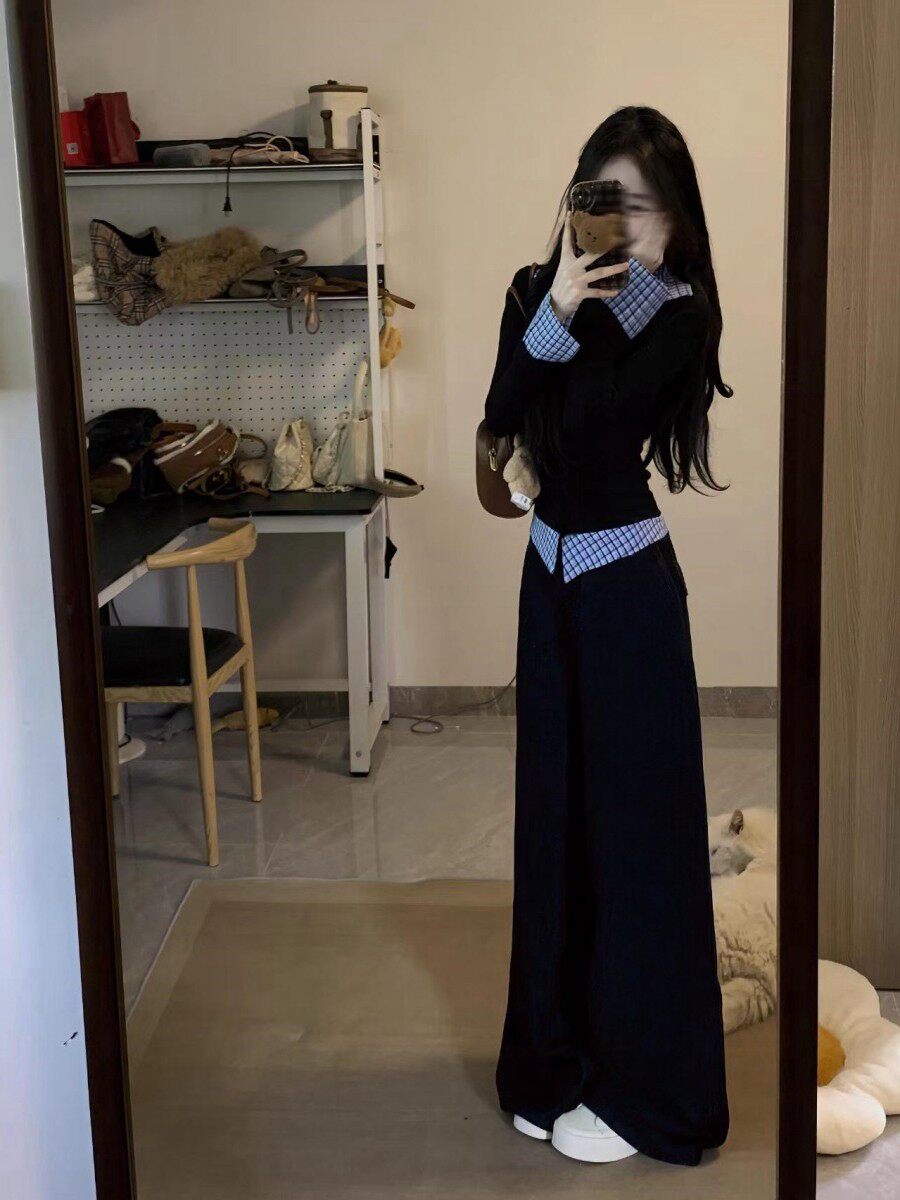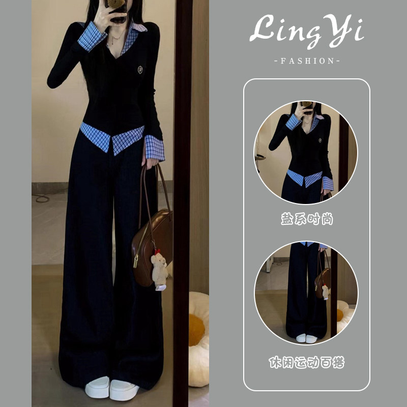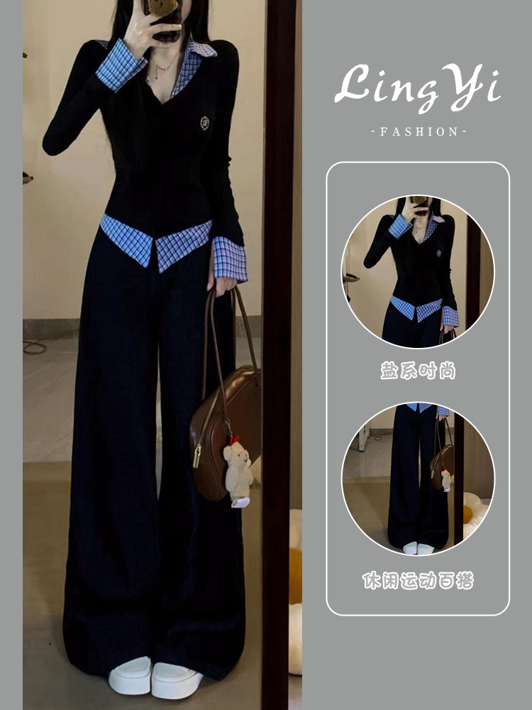 气质韩版时尚显瘦假两件长袖卫衣运动套装女春宽松长裤休闲两件套
