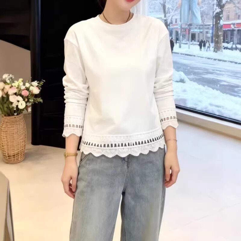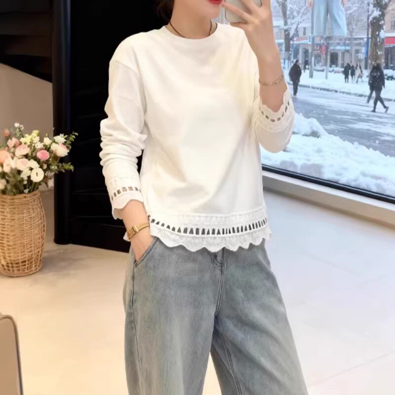 韩系蕾丝长袖T恤女2026春季新款大码胖MM宽松显瘦打底衫时髦上衣