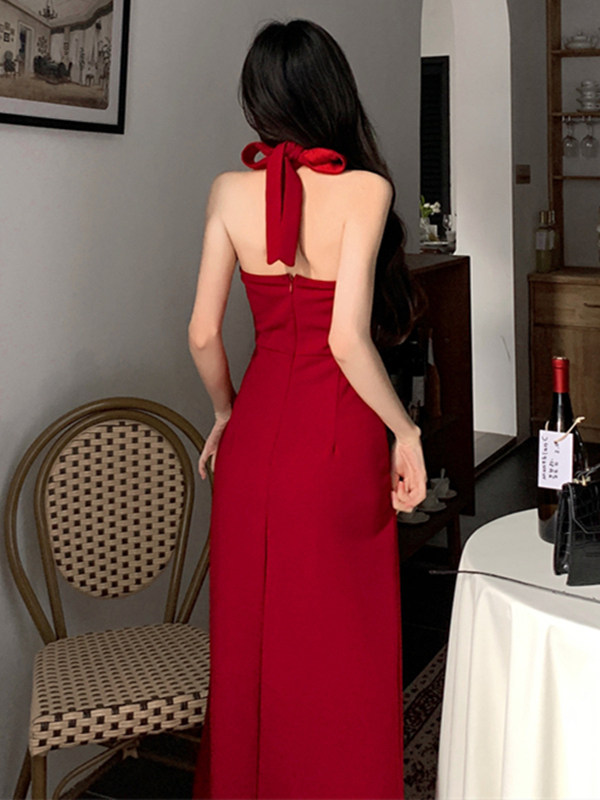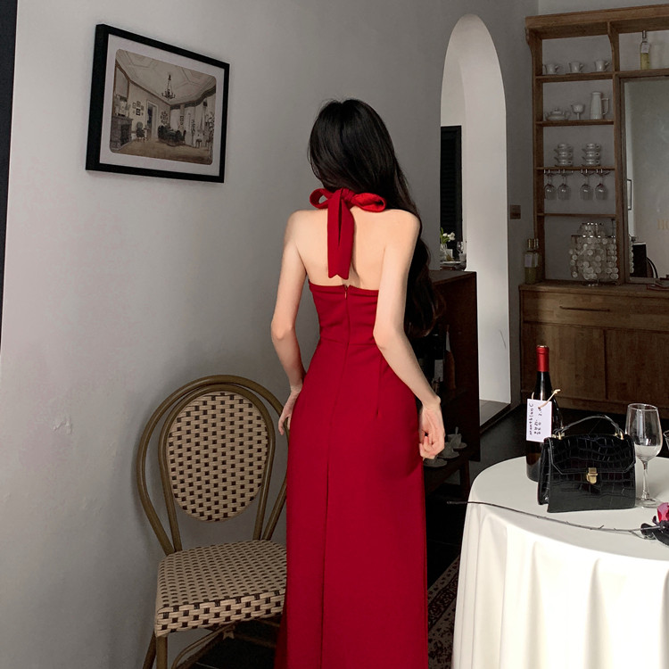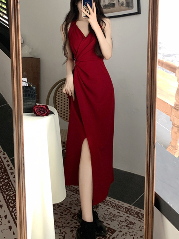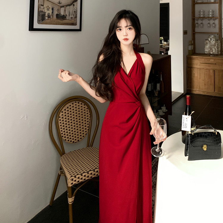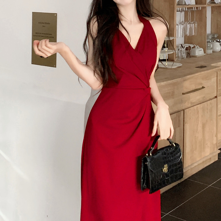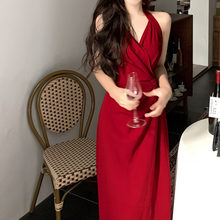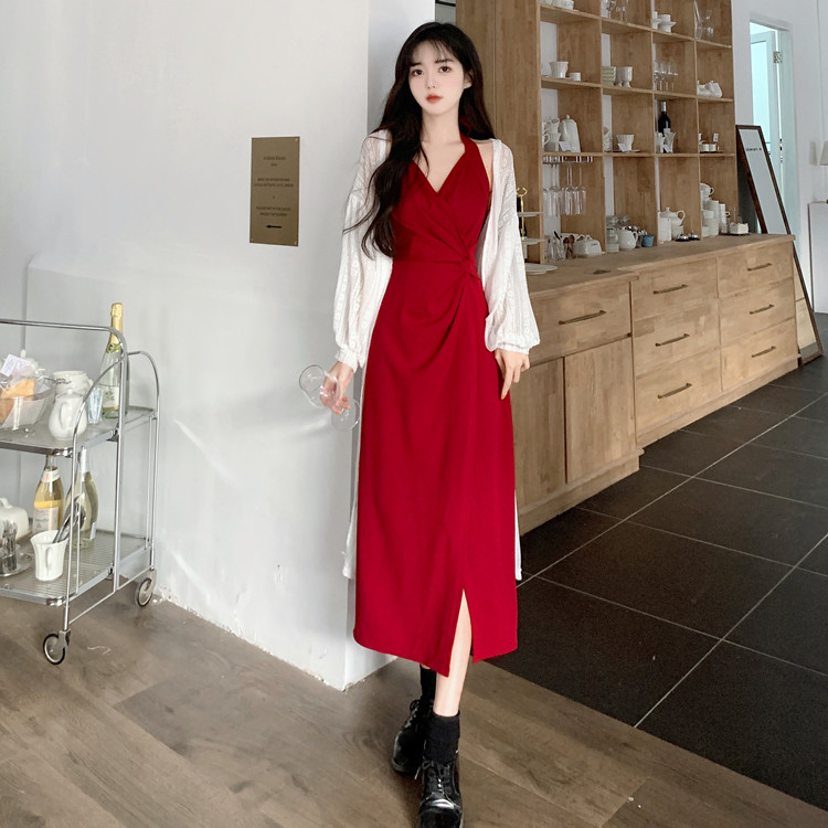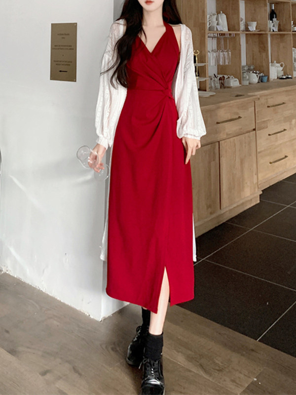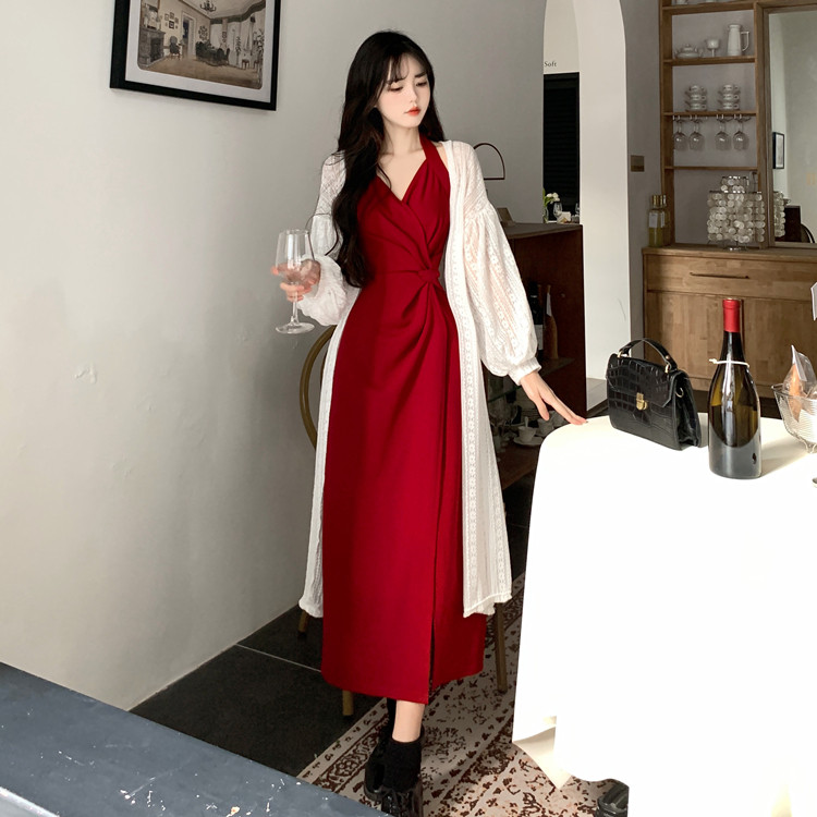 大码女装复古挂脖连衣裙两件套春夏蕾丝开衫胖mm红色吊带开叉长裙