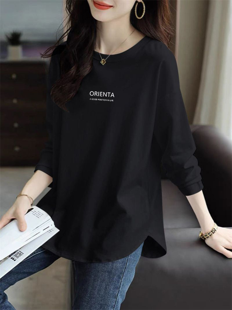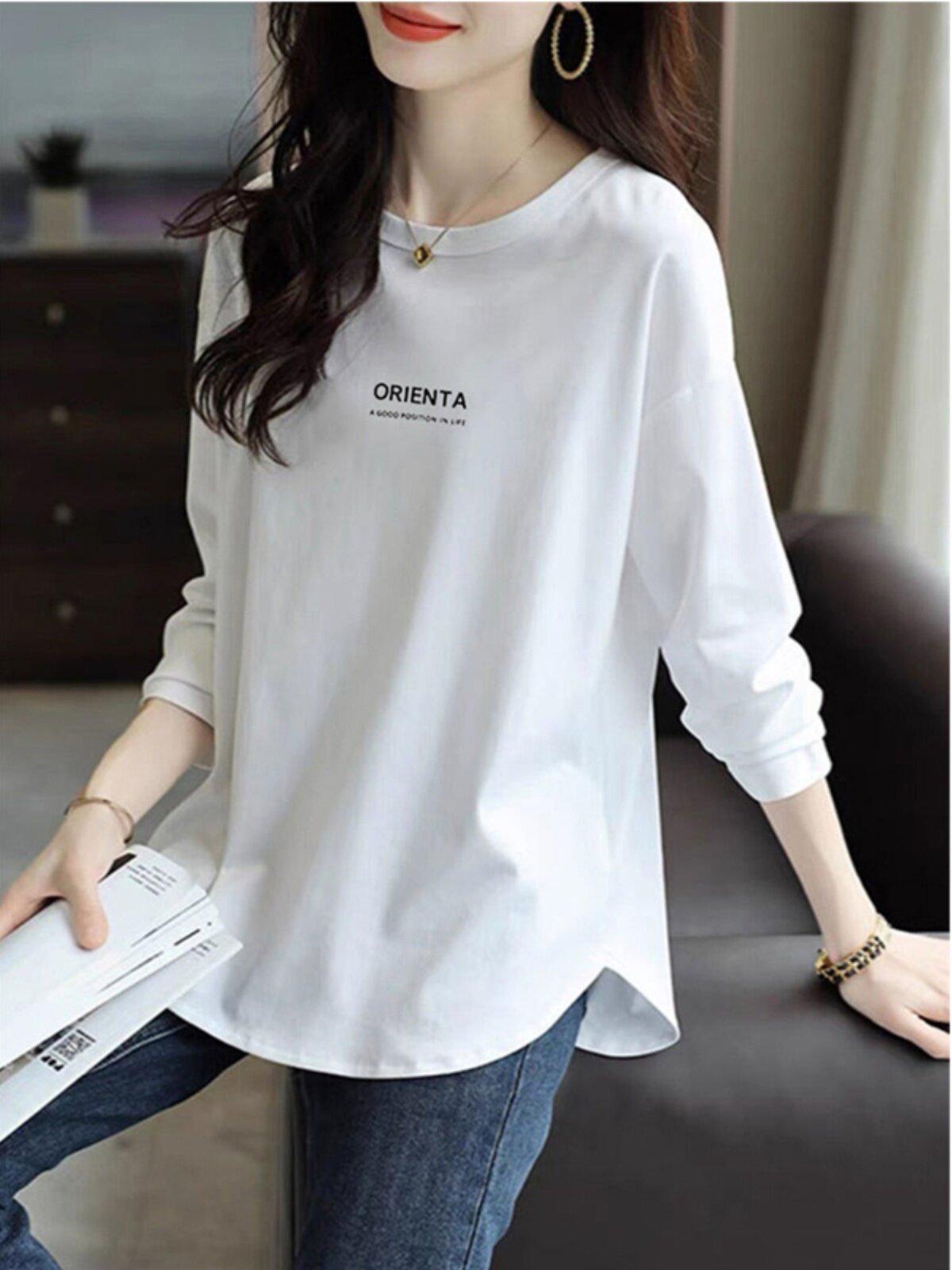 纯棉长袖t恤女2026新款春中长款打底小衫下摆弧形秋衣女外穿上衣