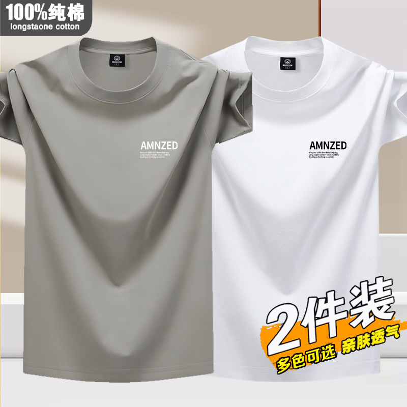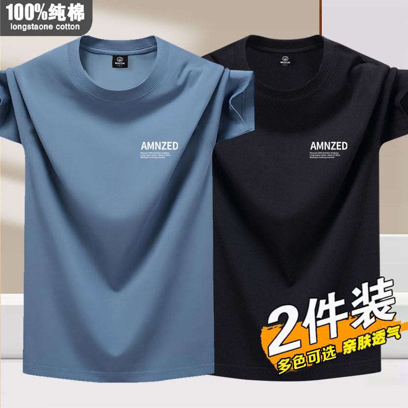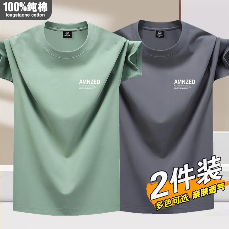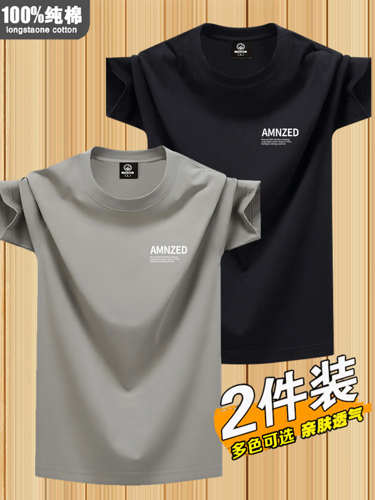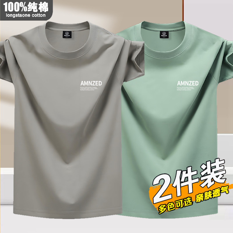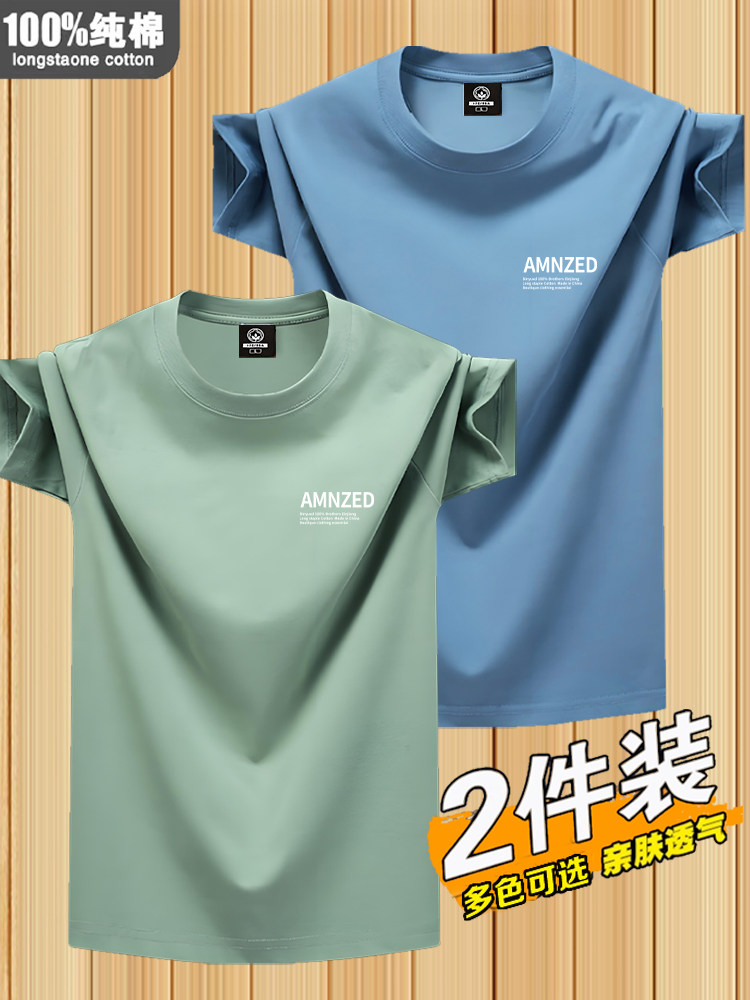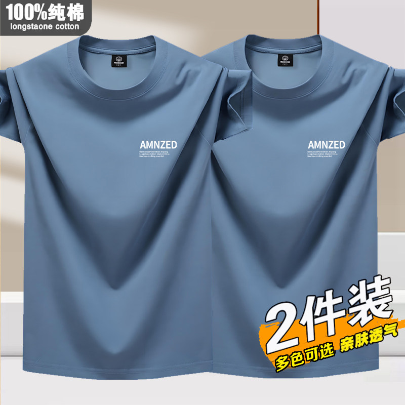 两件装100%棉短袖t恤男2025新款夏季薄款圆领宽松体恤上衣打底衫