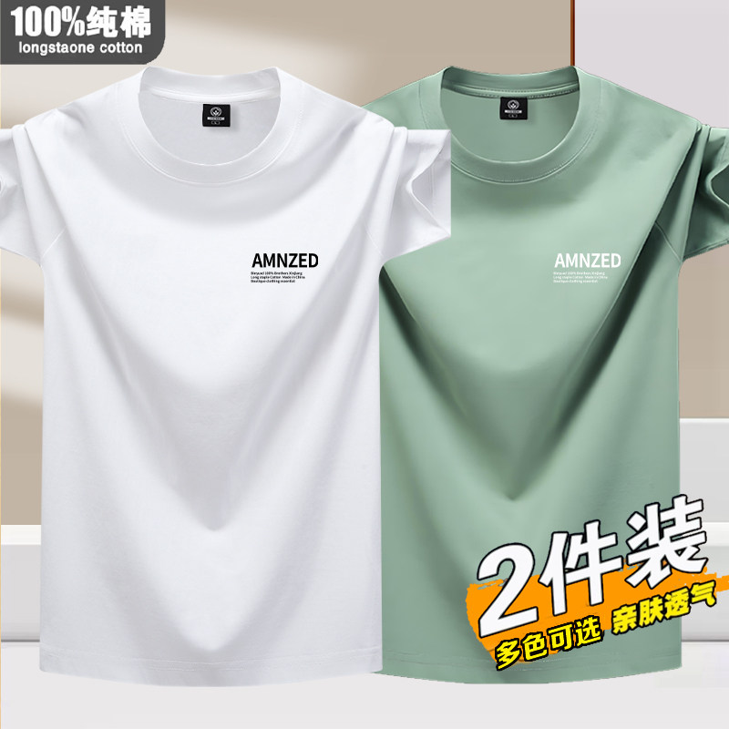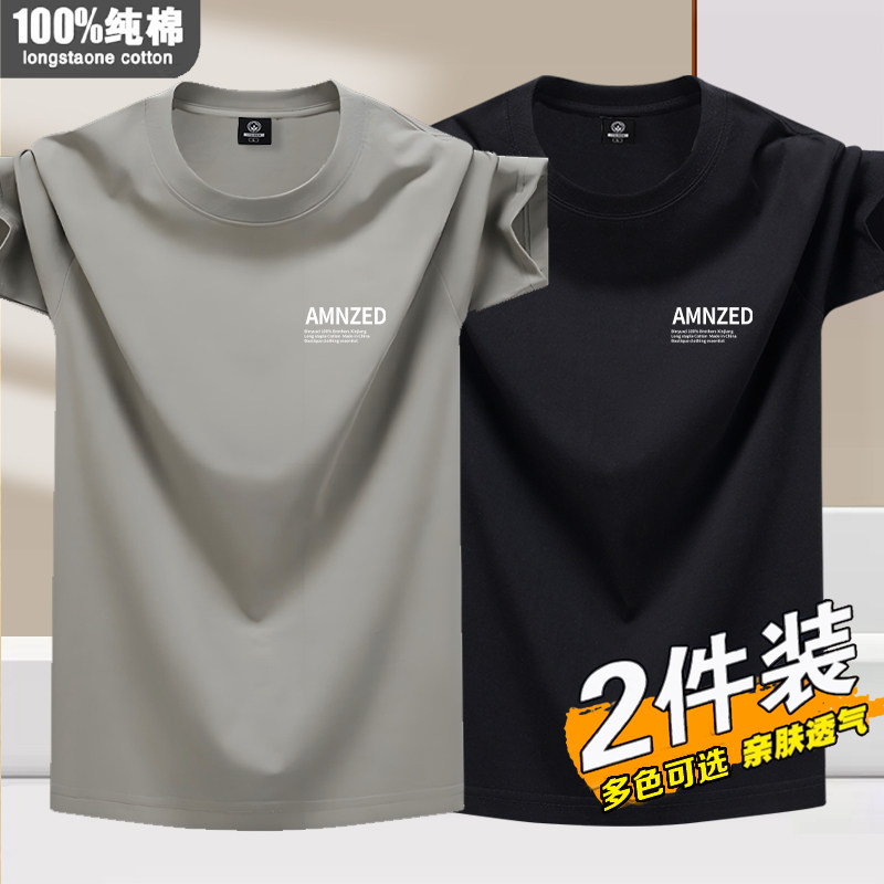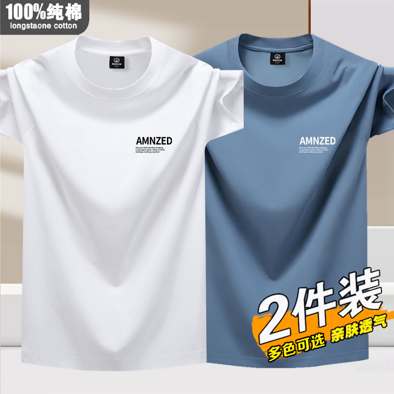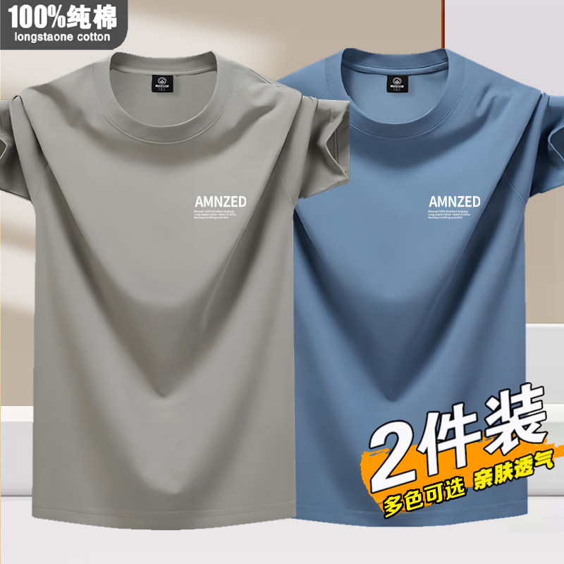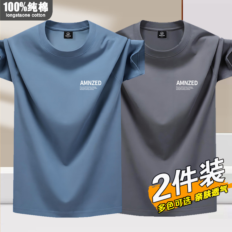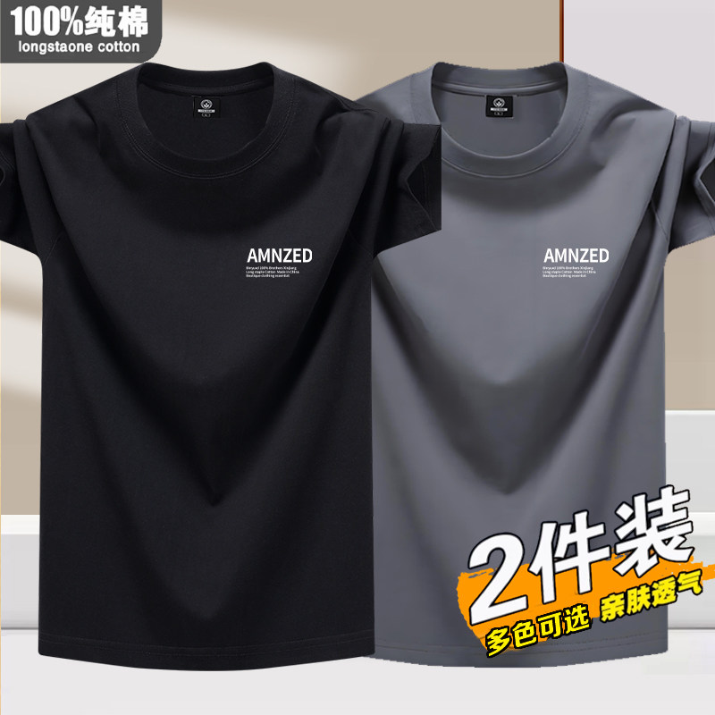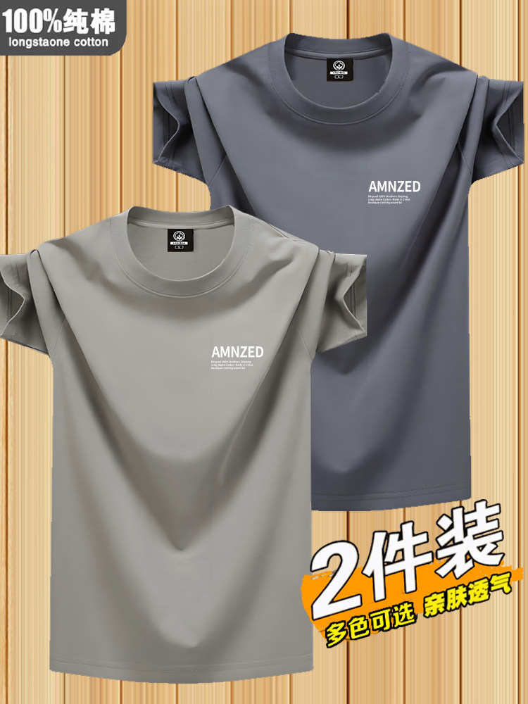 两件装100%棉短袖t恤男2025新款夏季薄款圆领宽松体恤上衣打底衫