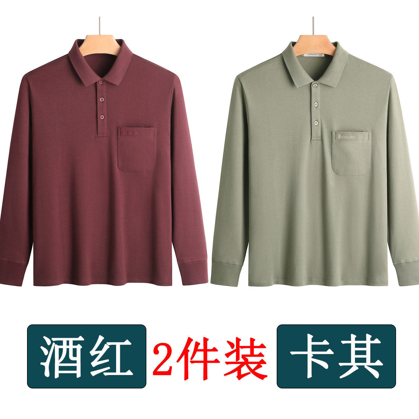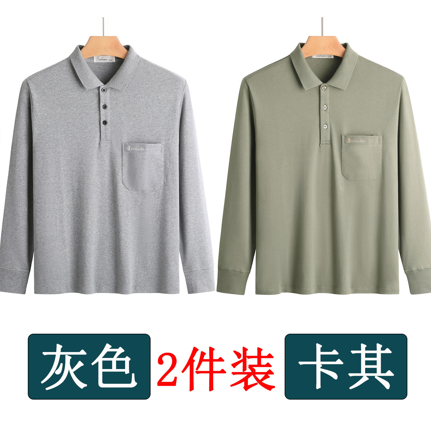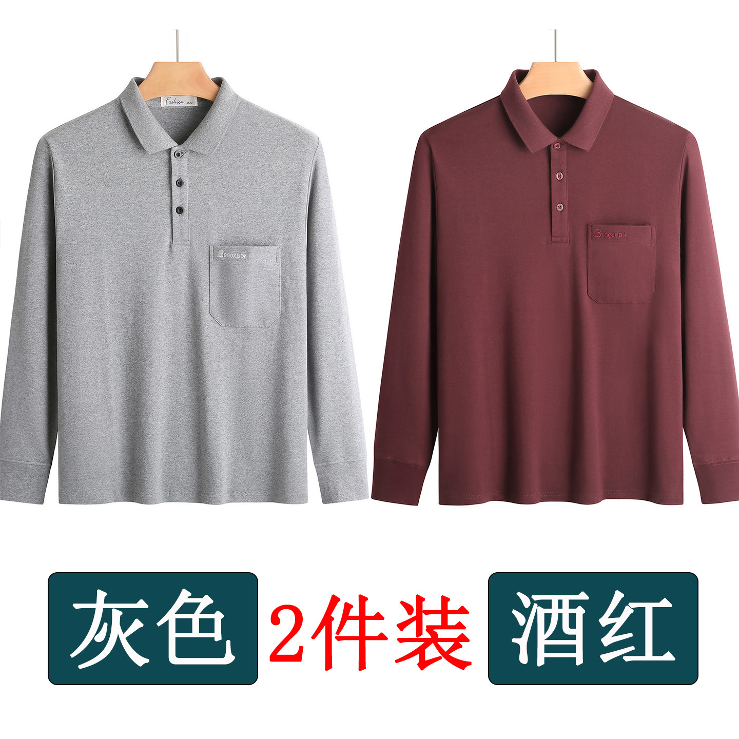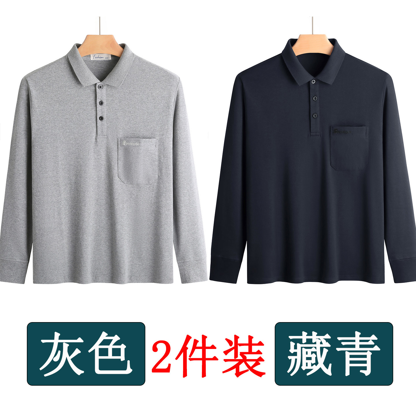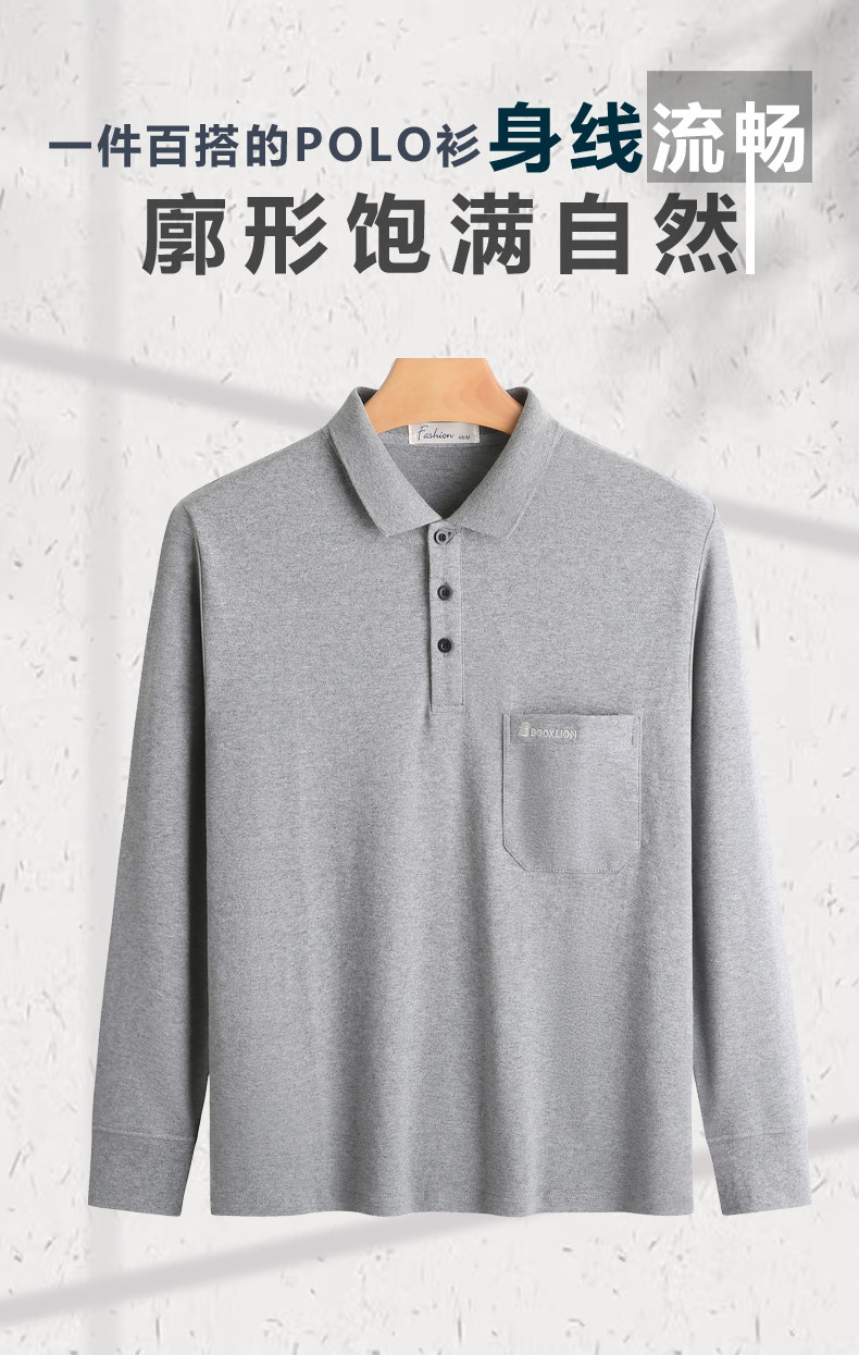 春秋新款纯棉长袖t恤男士翻领中老年人爸爸打底衫男装上衣有口袋