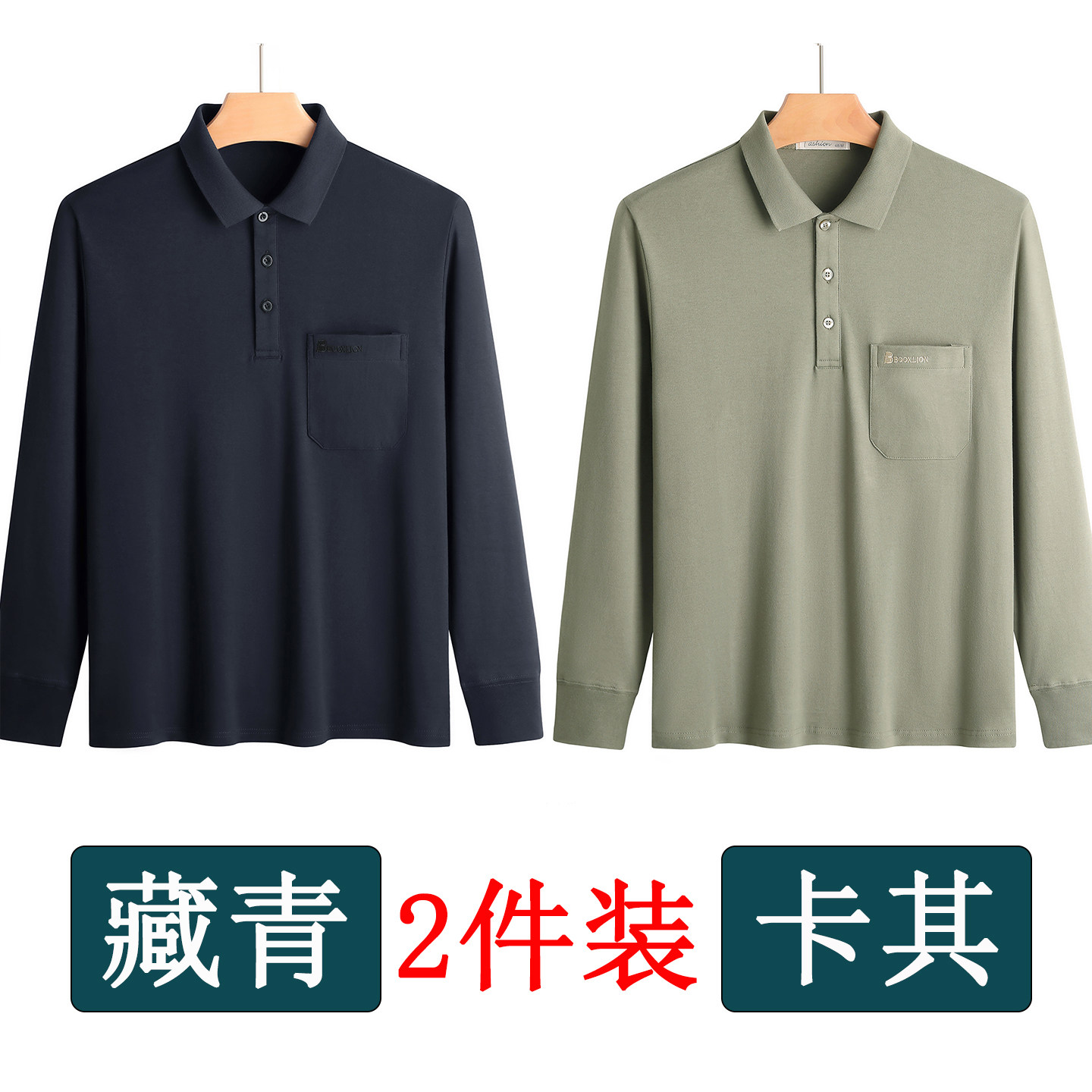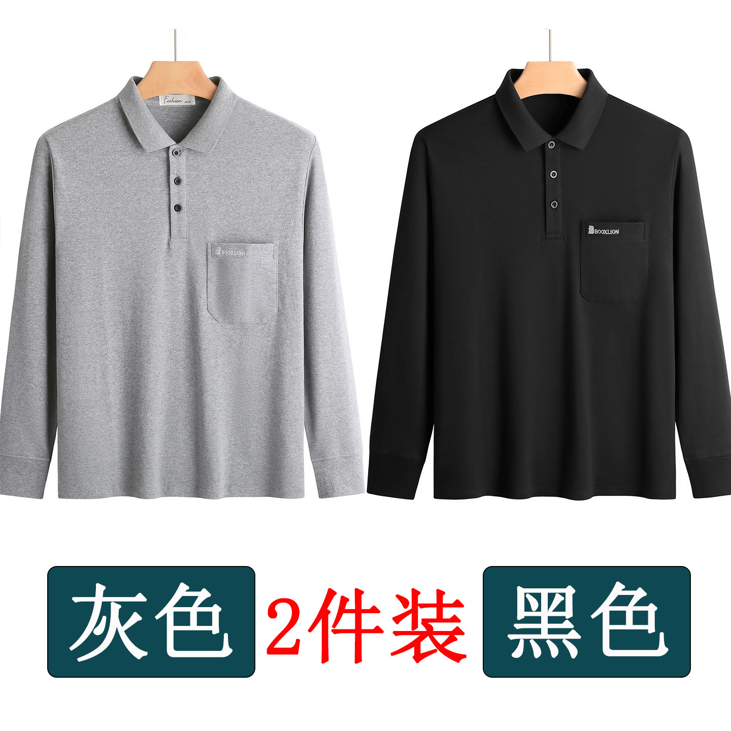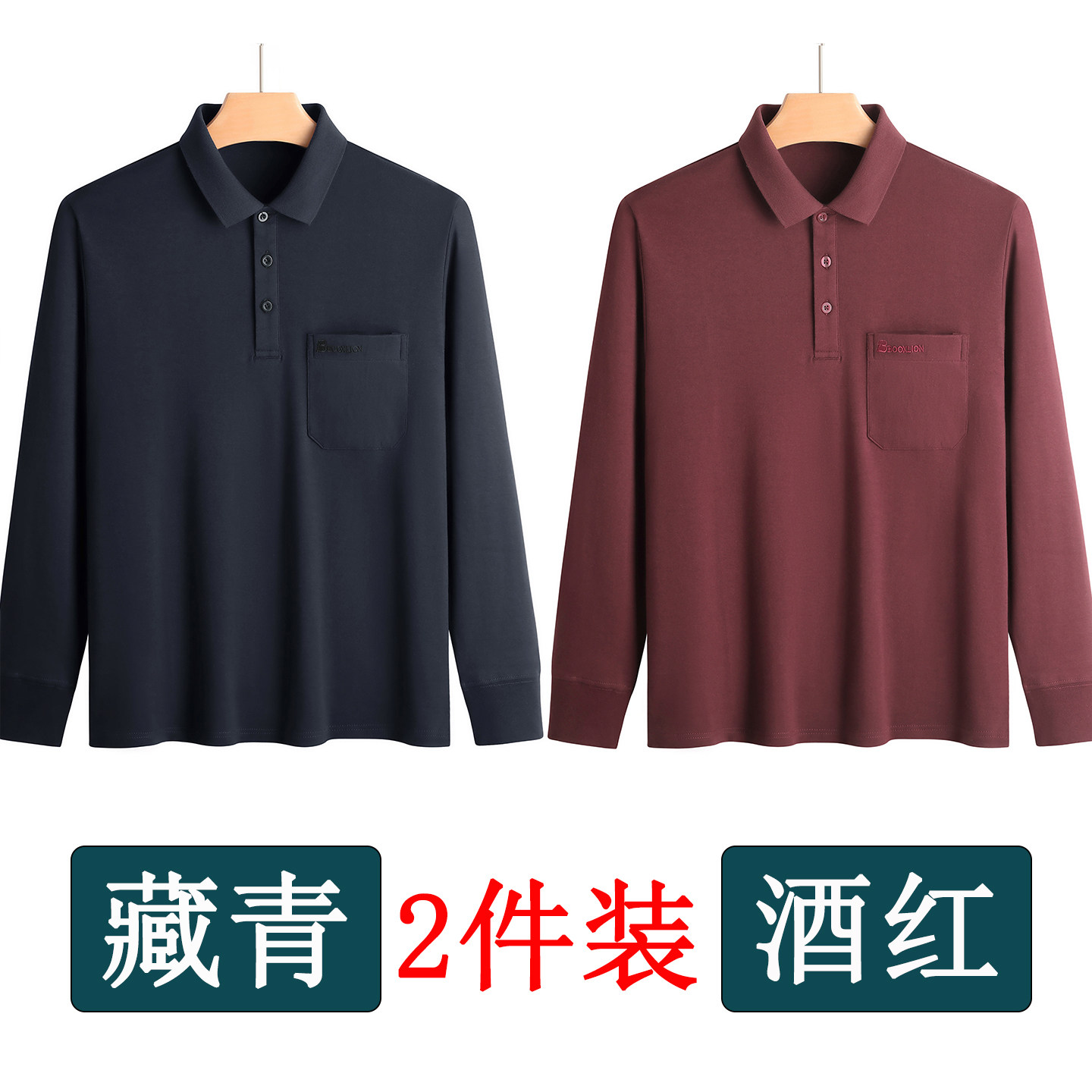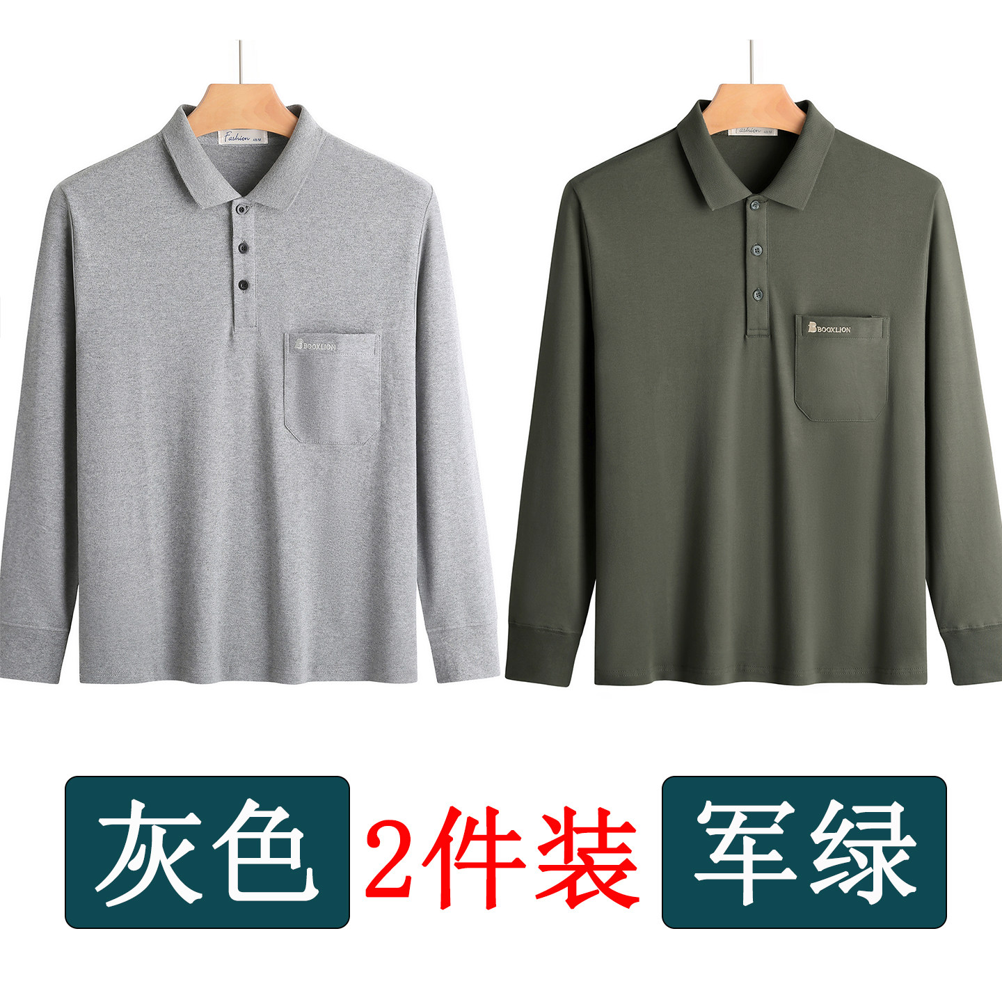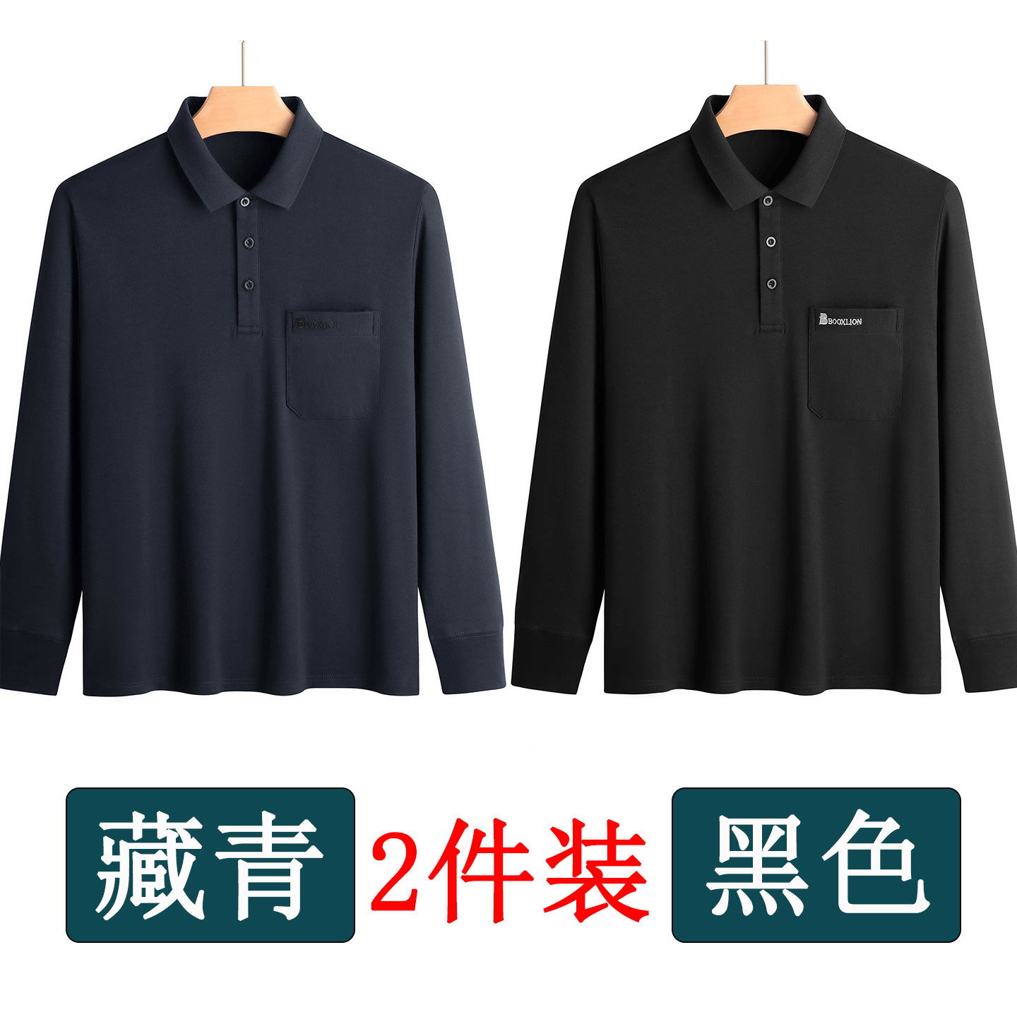 春秋新款纯棉长袖t恤男士翻领中老年人爸爸打底衫男装上衣有口袋