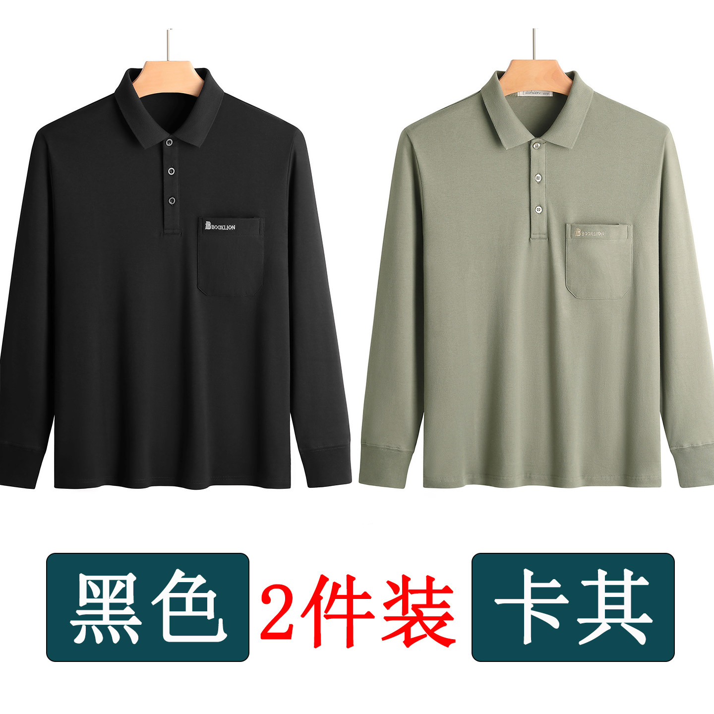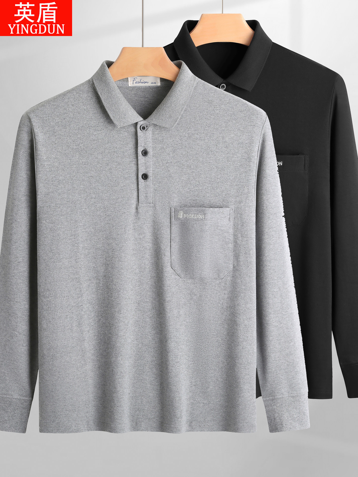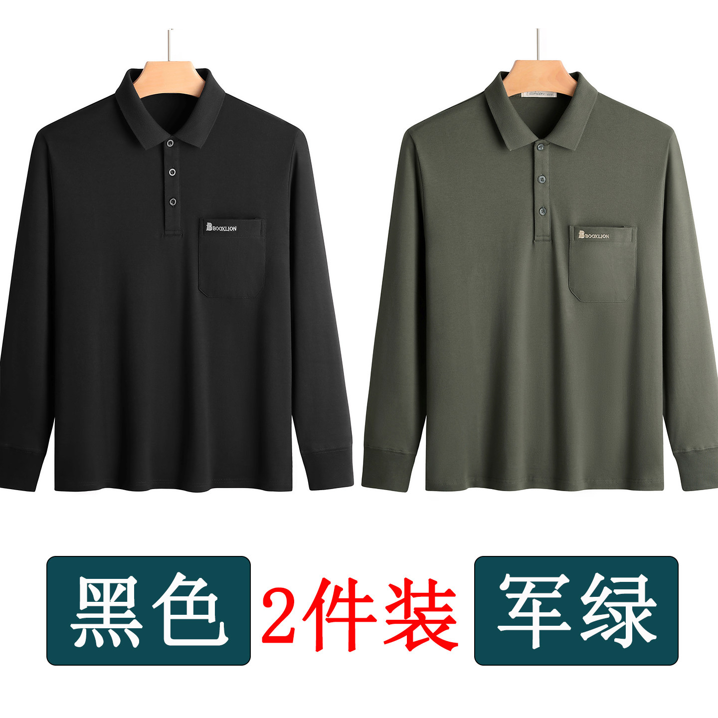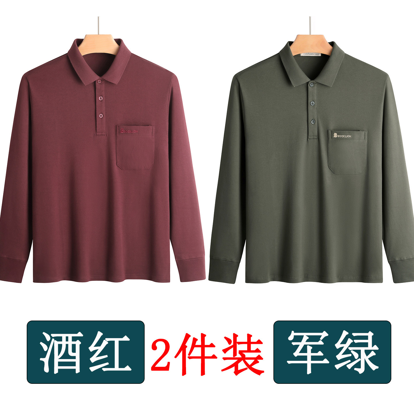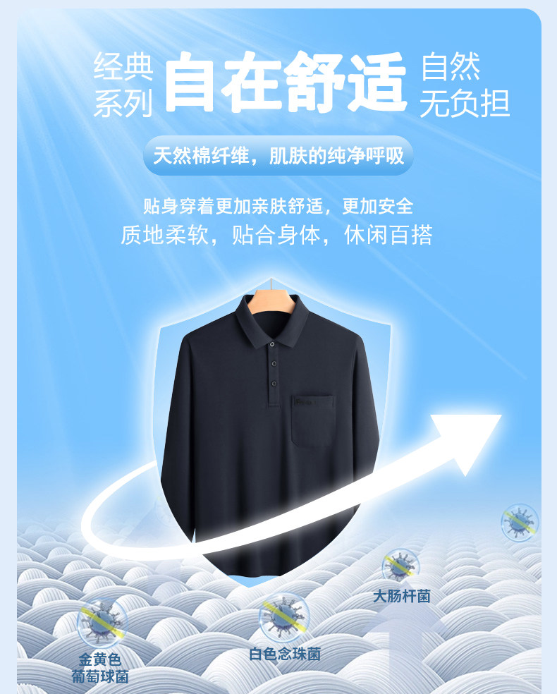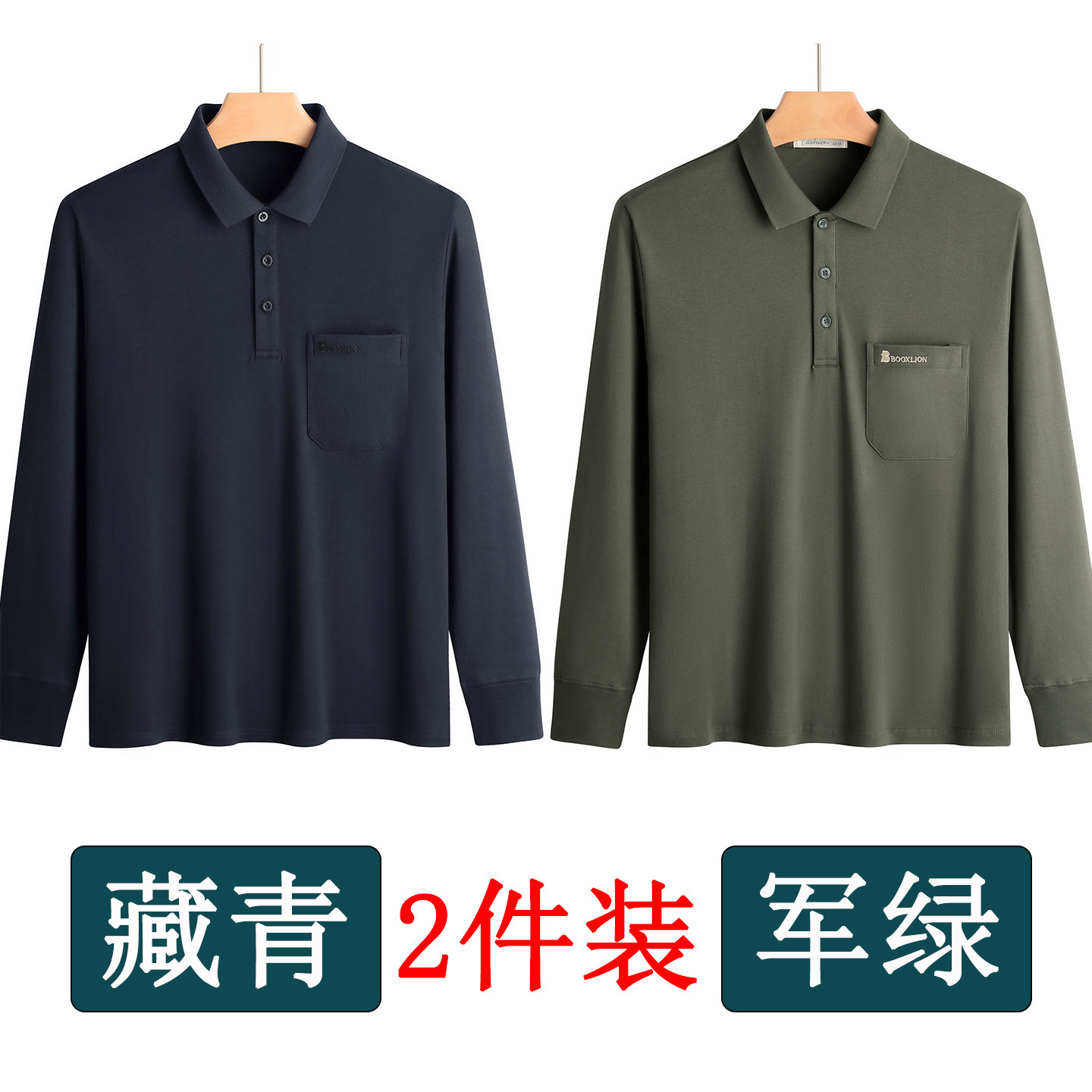 春秋新款纯棉长袖t恤男士翻领中老年人爸爸打底衫男装上衣有口袋