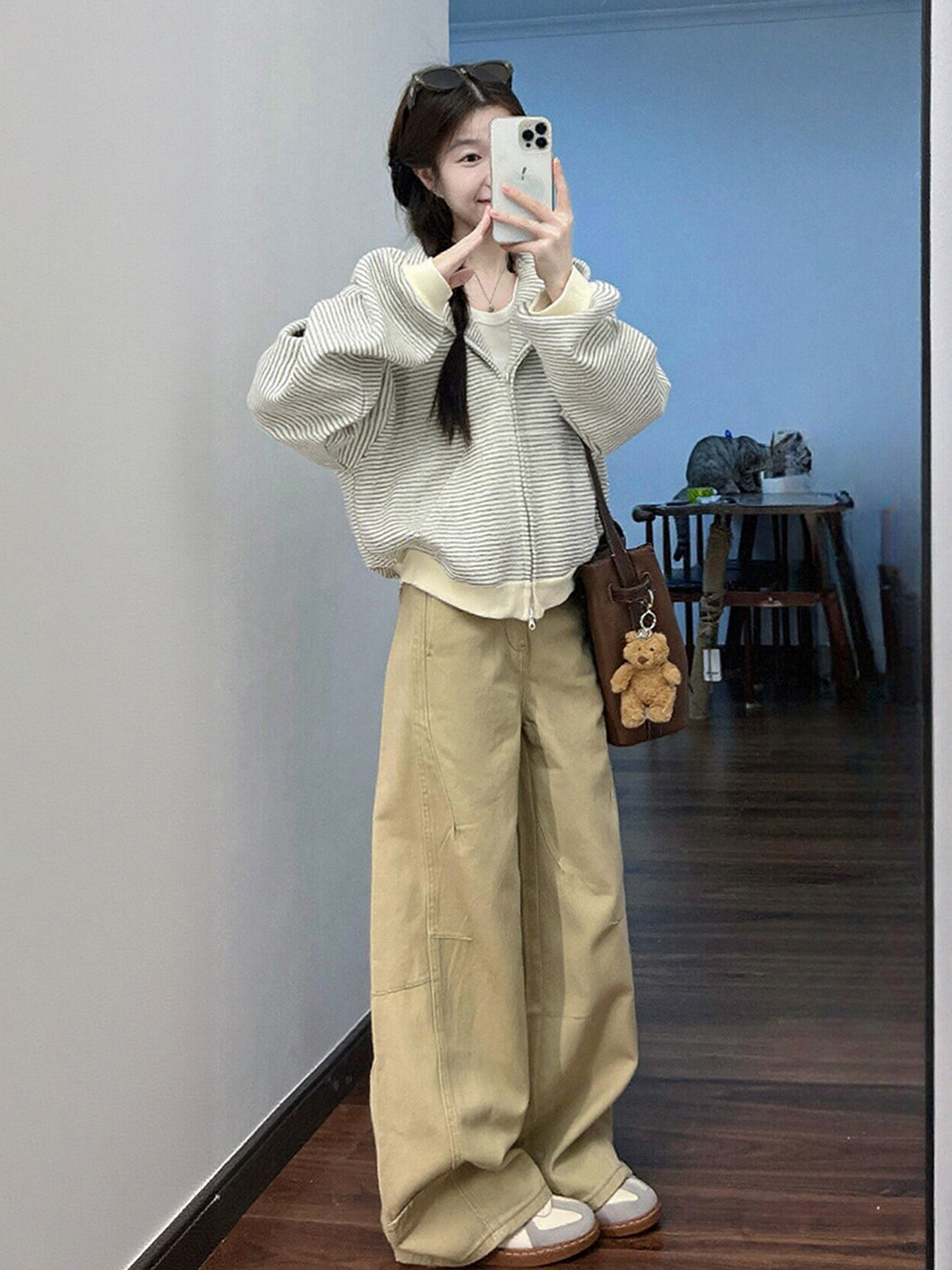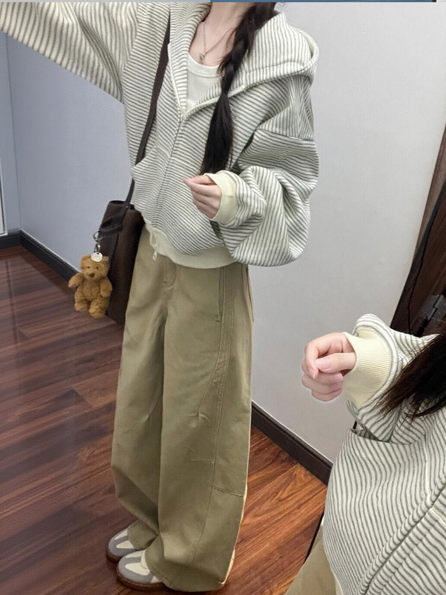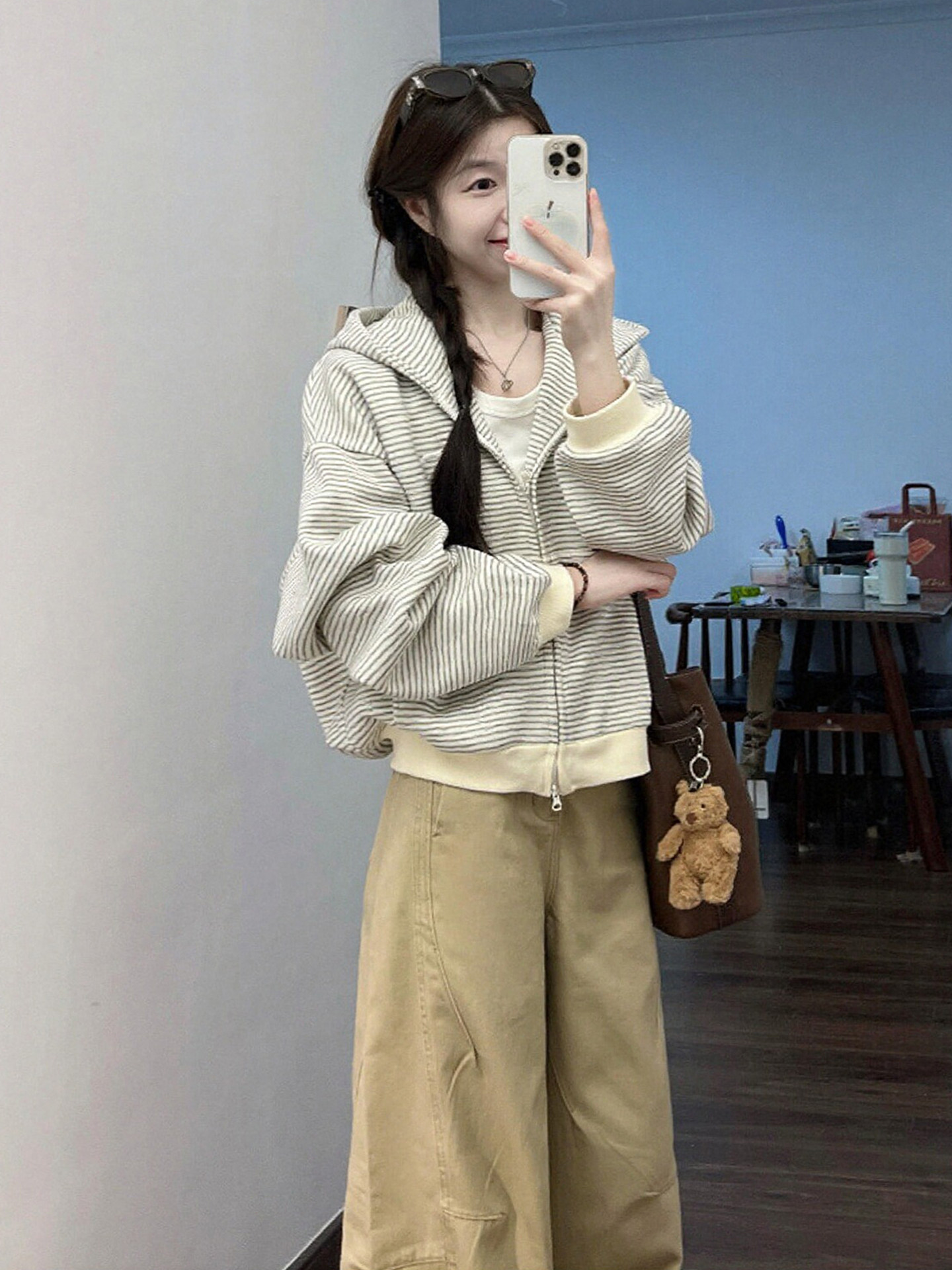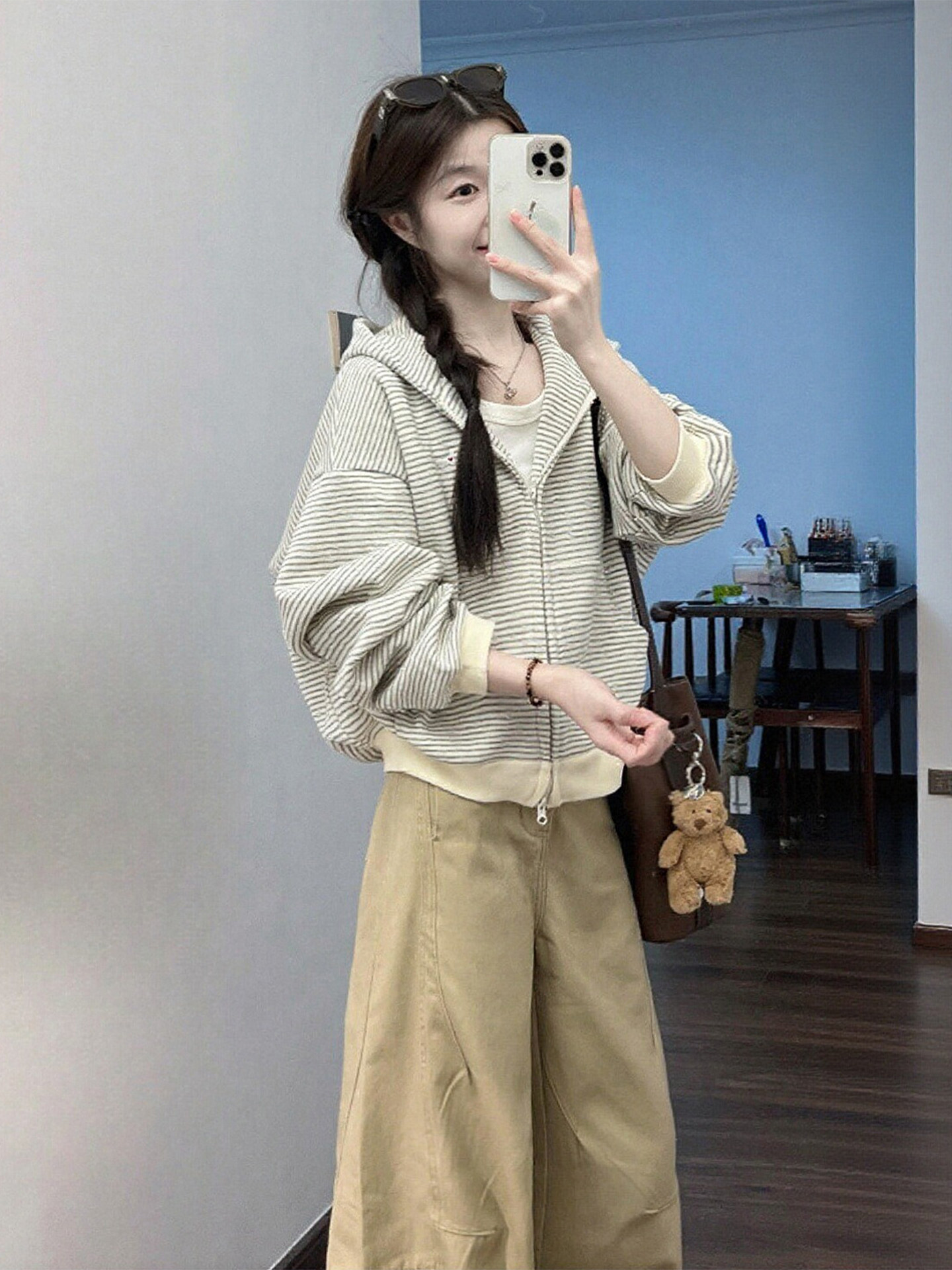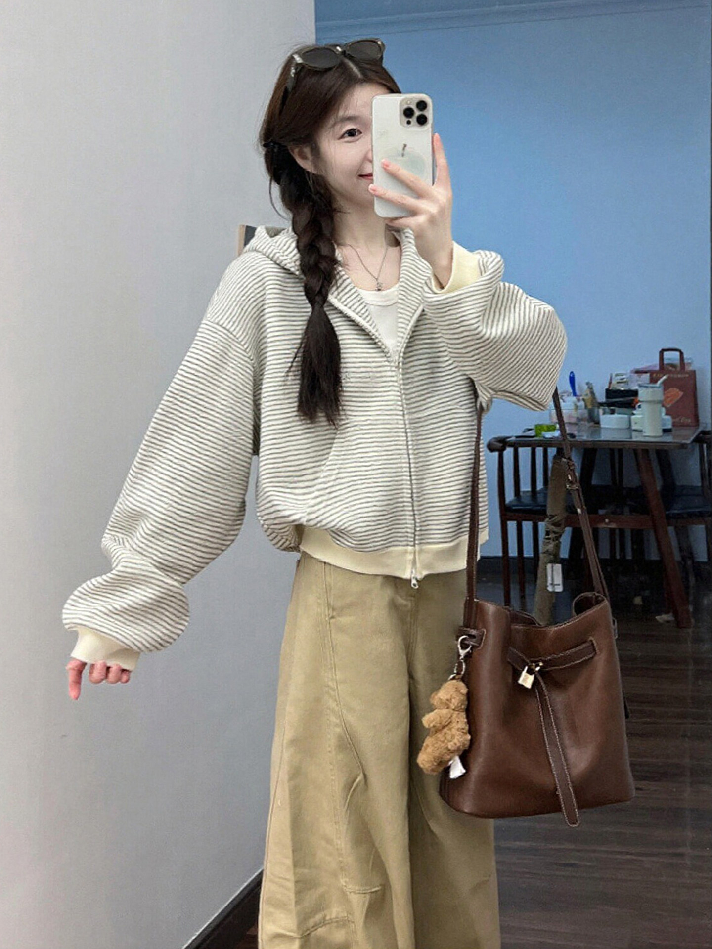 韩系慵懒风条纹拉链连帽卫衣外套女2025新款秋冬百搭显瘦开衫上衣