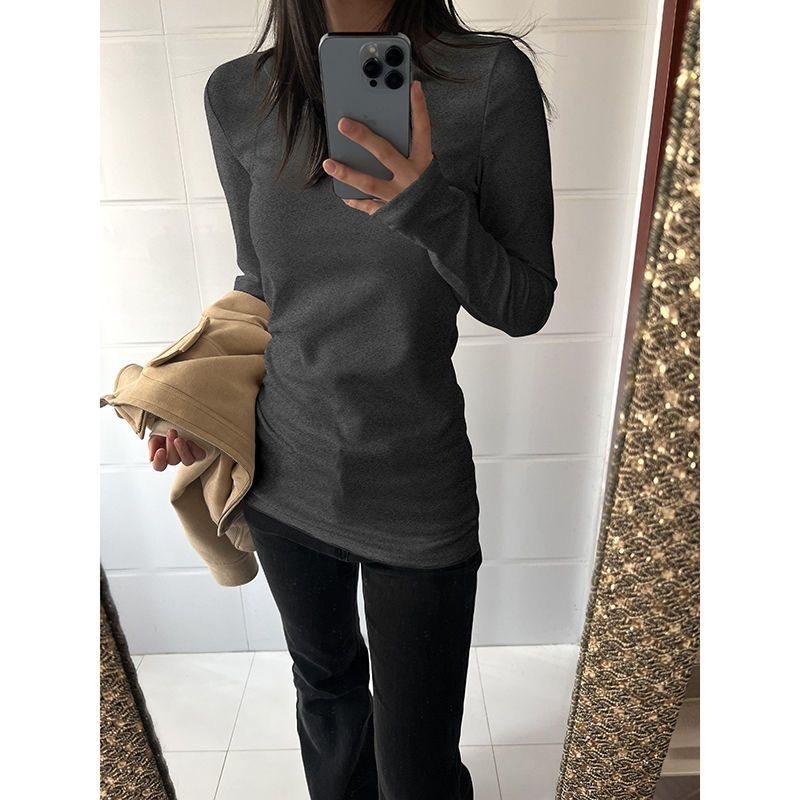 德绒白色正肩中长款长袖t恤女春秋冬韩系百搭圆领修身显瘦打底衫