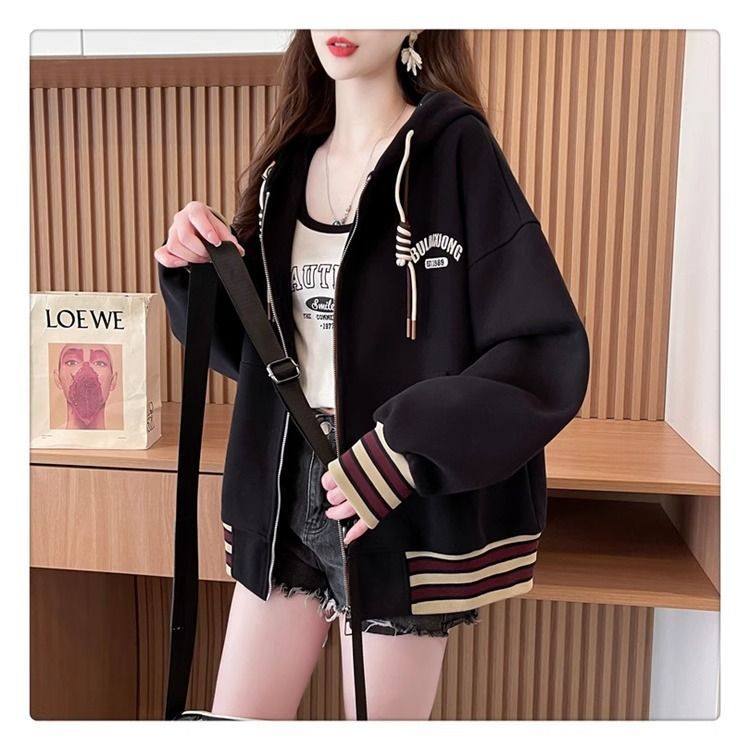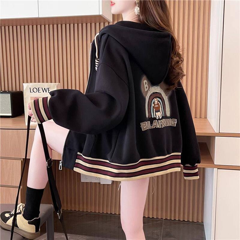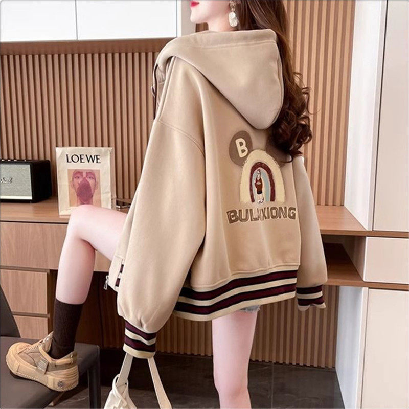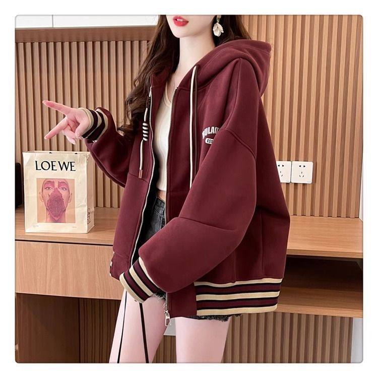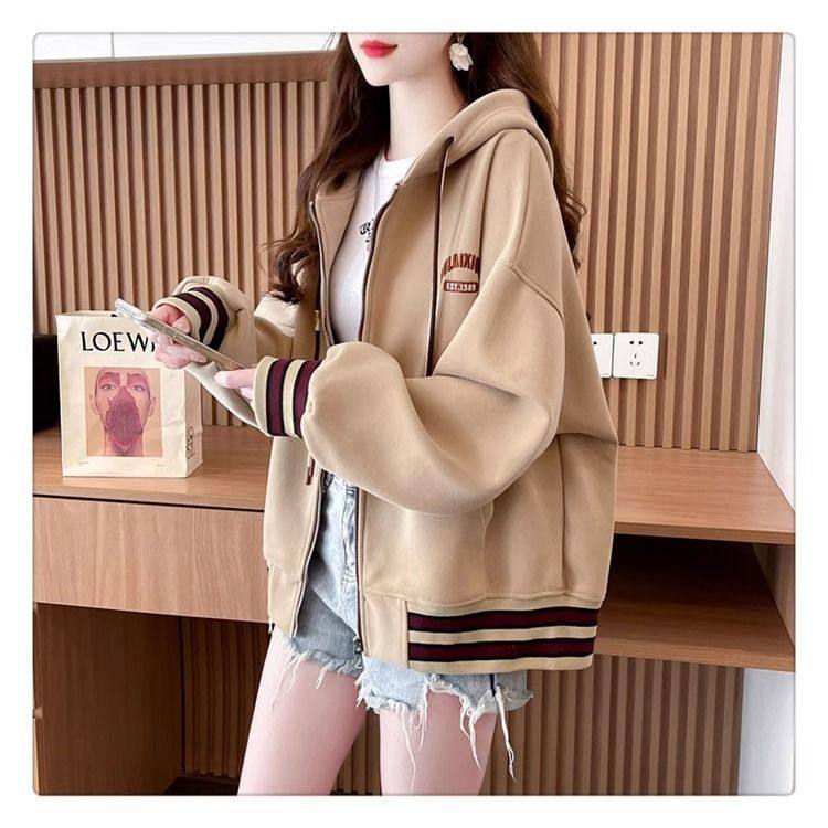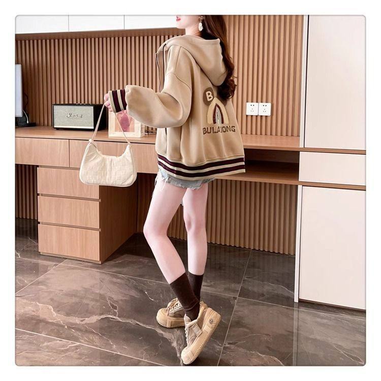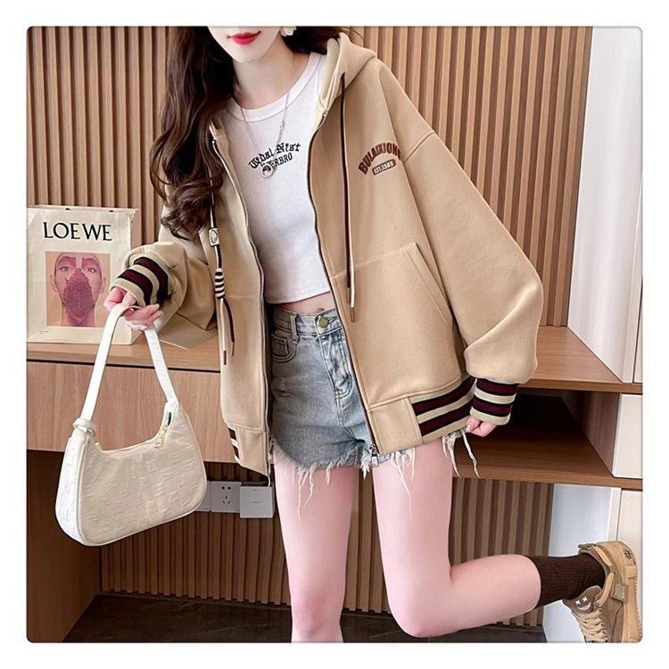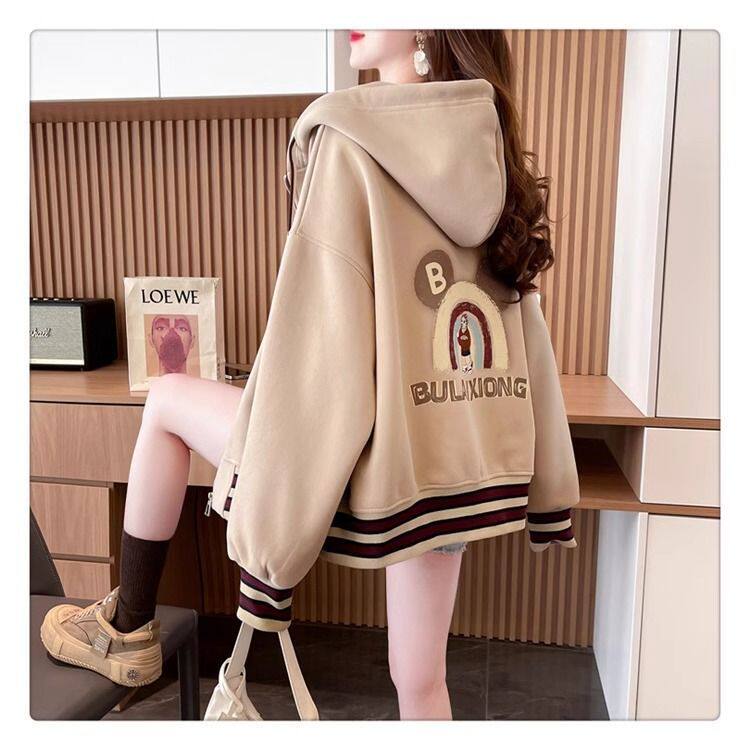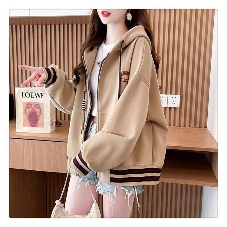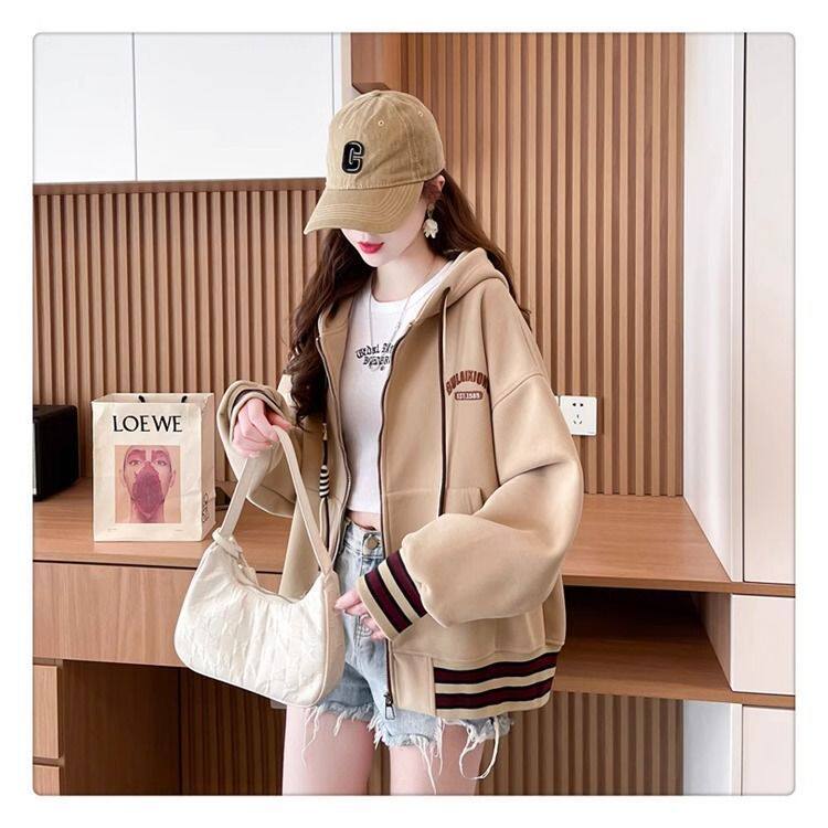 春秋冬美式复古连帽开衫卫衣少女初中高中学生休闲加绒棒球服外套