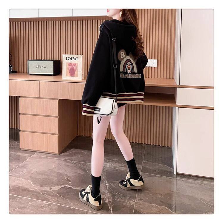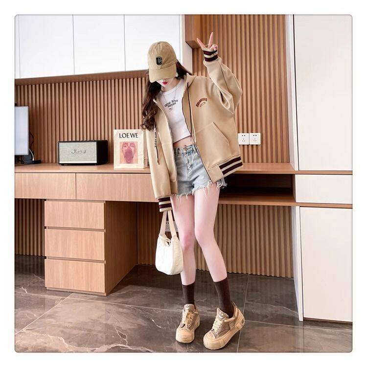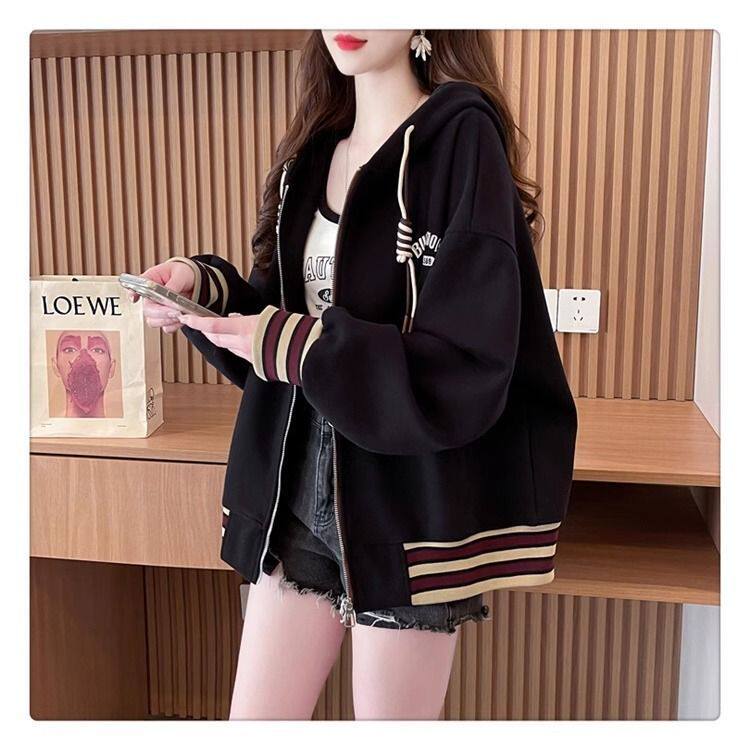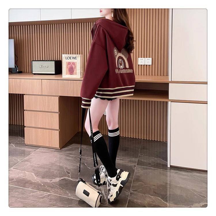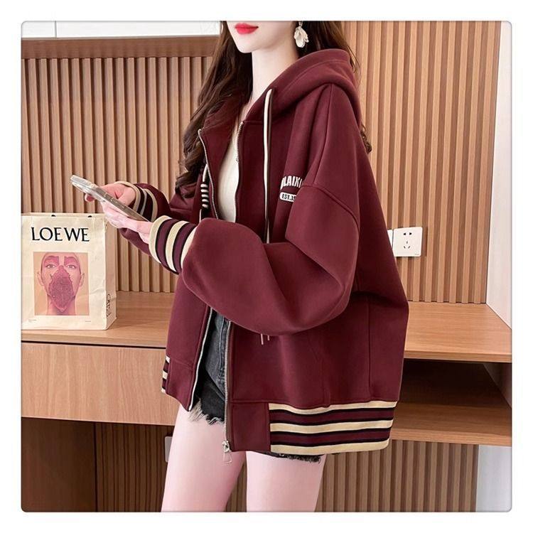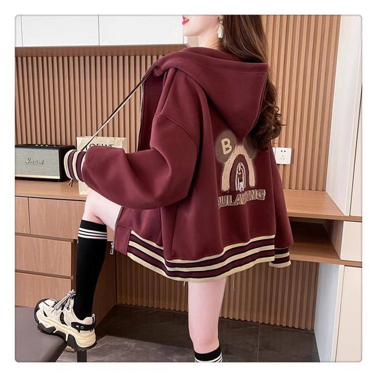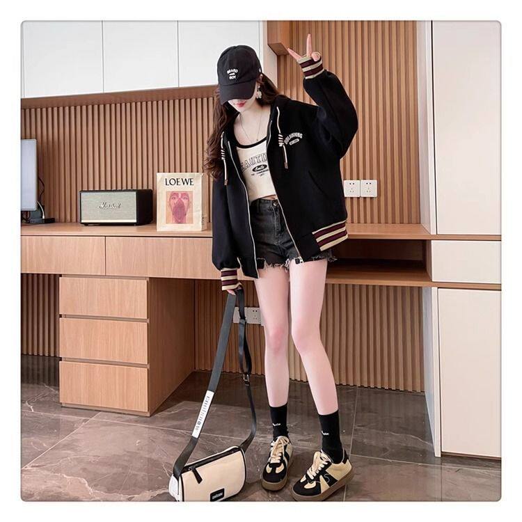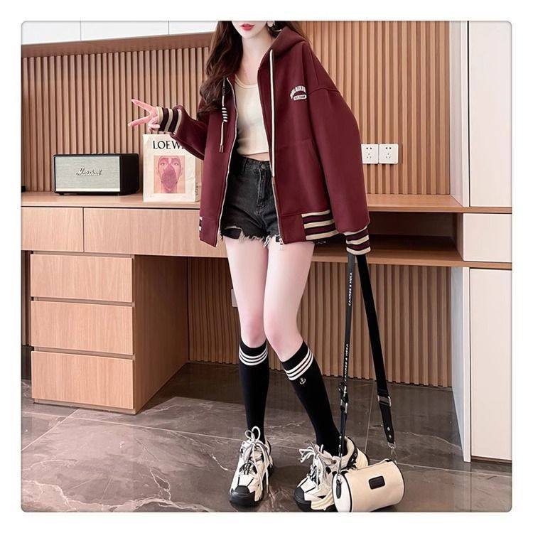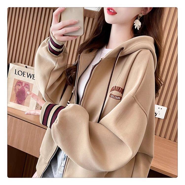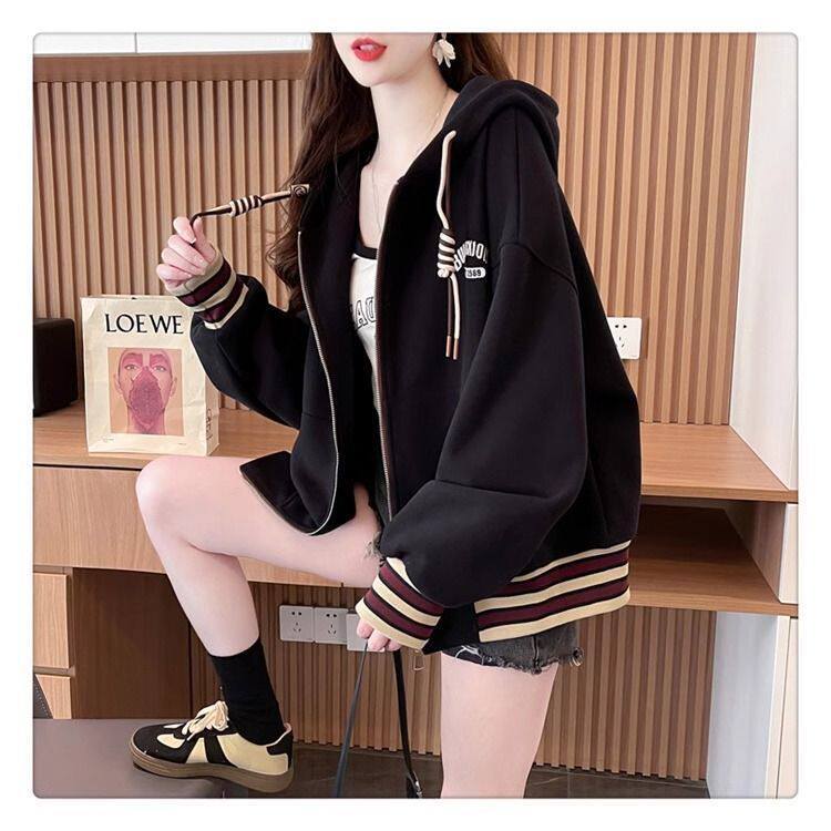 春秋冬美式复古连帽开衫卫衣少女初中高中学生休闲加绒棒球服外套
