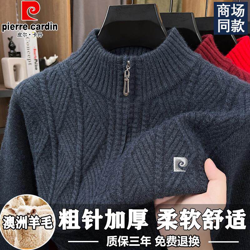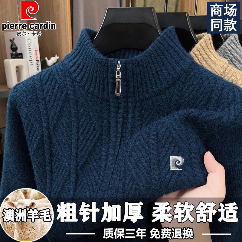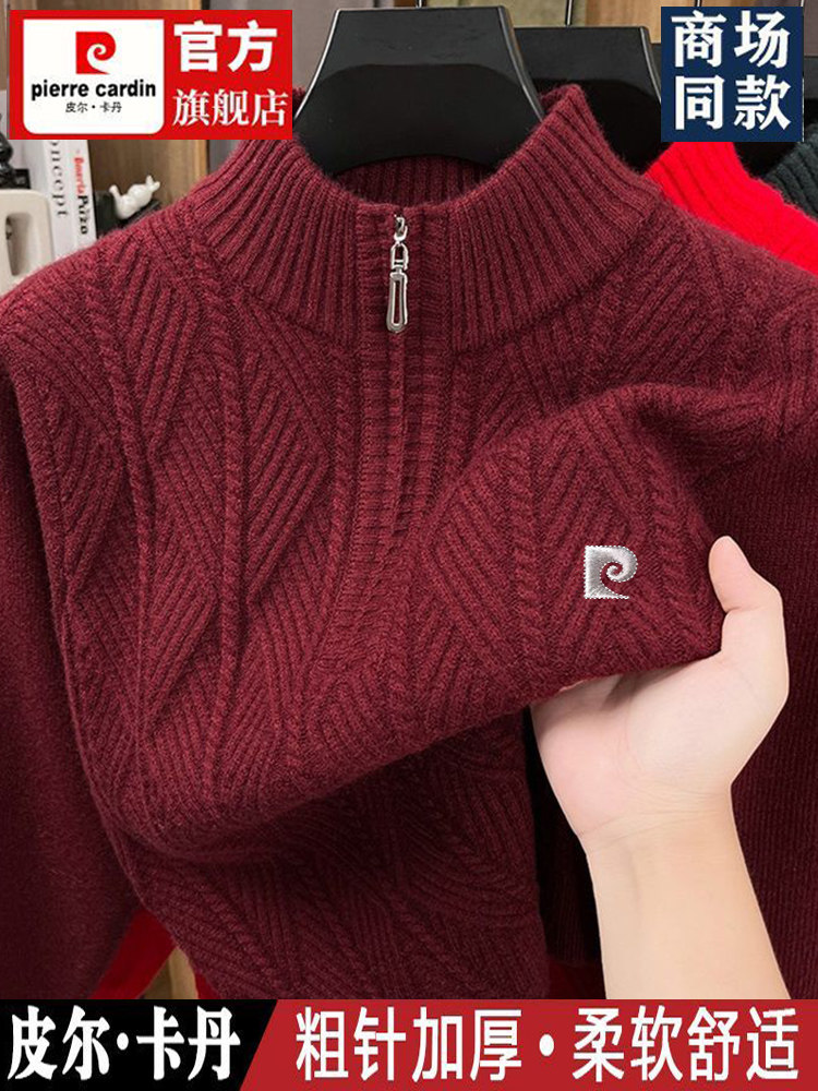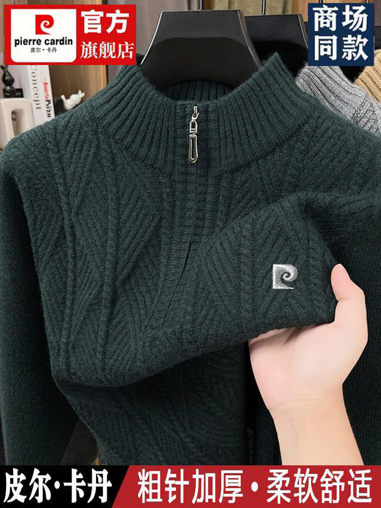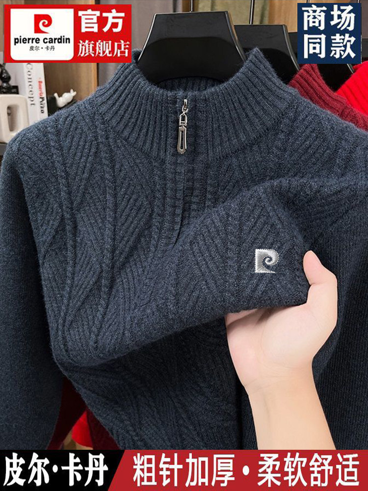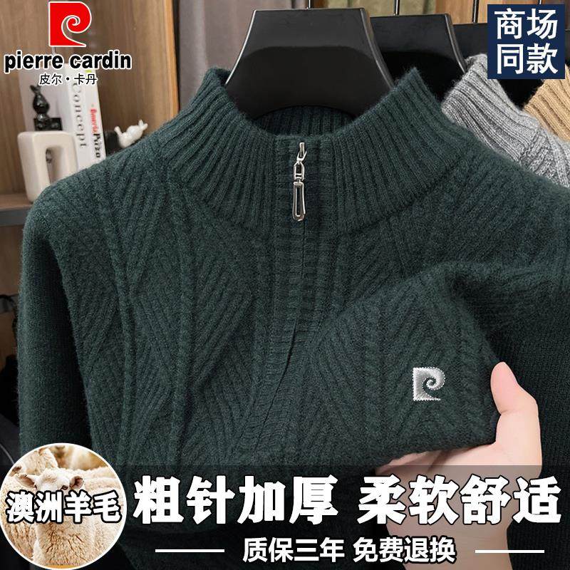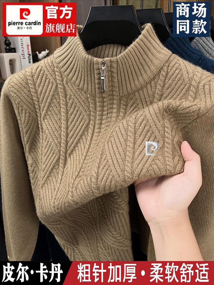 2025皮尔卡丹冬季男士加厚羊毛衫中年半高领拉炼粗针时尚休闲毛衣